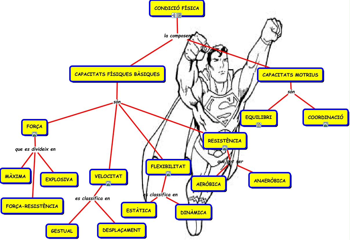 Este Cmap, tiene información relacionada con: CONDICIÓ FÍSICA, CAPACITATS FÍSIQUES BÀSIQUES són FLEXIBILITAT, FORÇA que es divideix en MÀXIMA, CAPACITATS MOTRIUS són COORDINACIÓ, CAPACITATS FÍSIQUES BÀSIQUES són VELOCITAT, FLEXIBILITAT es classifica en ESTÀTICA, VELOCITAT es classifica en GESTUAL, CONDICIÓ FÍSICA la composen CAPACITATS FÍSIQUES BÀSIQUES, FORÇA que es divideix en EXPLOSIVA, CAPACITATS MOTRIUS són EQUILIBRI, CAPACITATS FÍSIQUES BÀSIQUES són FORÇA, FLEXIBILITAT es classifica en DINÀMICA, RESISTÈNCIA que pot ser AERÒBICA, VELOCITAT es classifica en DESPLAÇAMENT, FORÇA que es divideix en FORÇA-RESISTÈNCIA, CONDICIÓ FÍSICA la composen CAPACITATS MOTRIUS, RESISTÈNCIA que pot ser ANAERÒBICA, CAPACITATS FÍSIQUES BÀSIQUES són RESISTÈNCIA