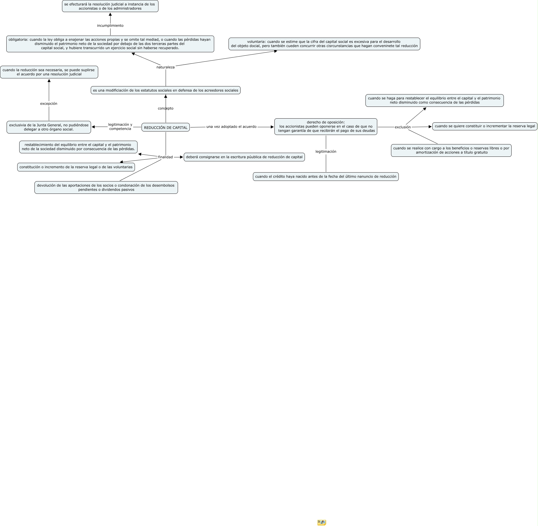 Este Cmap, tiene información relacionada con: escenario 10.2, REDUCCIÓN DE CAPITAL finalidad deberá consignarse en la escritura púublica de reducción de capital, derecho de oposición: los accionistas pueden oponerse en el caso de que no tengan garantía de que recibirán el pago de sus deudas legitimación cuando el crédito haya nacido antes de la fecha del último nanuncio de reducción, REDUCCIÓN DE CAPITAL naturaleza obligatoria: cuando la ley obliga a enajenar las acciones propias y se omite tal mediad, o cuando las pérdidas hayan disminuido el patrimonio neto de la sociedad por debajo de las dos terceras partes del capital social, y hubiere transcurrido un ejercicio social sin haberse recuperado., exclusivia de la Junta General, no pudiéndose delegar a otro órgano social. excepción cuando la reducción sea necesaria, se puede suplirse el acuerdo por una resolución judicial, REDUCCIÓN DE CAPITAL finalidad restablecimiento del equilibrio entre el capital y el patrimonio neto de la sociedad disminuido por consecuencia de las pérdidas., REDUCCIÓN DE CAPITAL finalidad devolución de las aportaciones de los socios o condonación de los desembolsos pendientes o dividendos pasivos, REDUCCIÓN DE CAPITAL una vez adoptado el acuerdo derecho de oposición: los accionistas pueden oponerse en el caso de que no tengan garantía de que recibirán el pago de sus deudas, derecho de oposición: los accionistas pueden oponerse en el caso de que no tengan garantía de que recibirán el pago de sus deudas exclusión cuando se haga para restablecer el equilibrio entre el capital y el patrimonio neto disminuido como consecuencia de las pérdidas, REDUCCIÓN DE CAPITAL naturaleza voluntaria: cuando se estime que la cifra del capital social es excesiva para el desarrollo del objeto docial, pero también cueden concurrir otras cisrcunstancias que hagan conveninete tal reducción, obligatoria: cuando la ley obliga a enajenar las acciones propias y se omite tal mediad, o cuando las pérdidas hayan disminuido el patrimonio neto de la sociedad por debajo de las dos terceras partes del capital social, y hubiere transcurrido un ejercicio social sin haberse recuperado. incumplimiento se efecturará la resolución judicial a instancia de los accionistas o de los administradores, REDUCCIÓN DE CAPITAL concepto es una modificiación de los estatutos sociales en defensa de los acreedores sociales, derecho de oposición: los accionistas pueden oponerse en el caso de que no tengan garantía de que recibirán el pago de sus deudas exclusión cuando se realice con cargo a los beneficios o reservas libres o por amortización de acciones a título gratuito, derecho de oposición: los accionistas pueden oponerse en el caso de que no tengan garantía de que recibirán el pago de sus deudas exclusión cuando se quiere constituir o incrementar la reserva legal, REDUCCIÓN DE CAPITAL finalidad constitución o incremento de la reserva legal o de las voluntarias, REDUCCIÓN DE CAPITAL legitimación y competencia exclusivia de la Junta General, no pudiéndose delegar a otro órgano social.