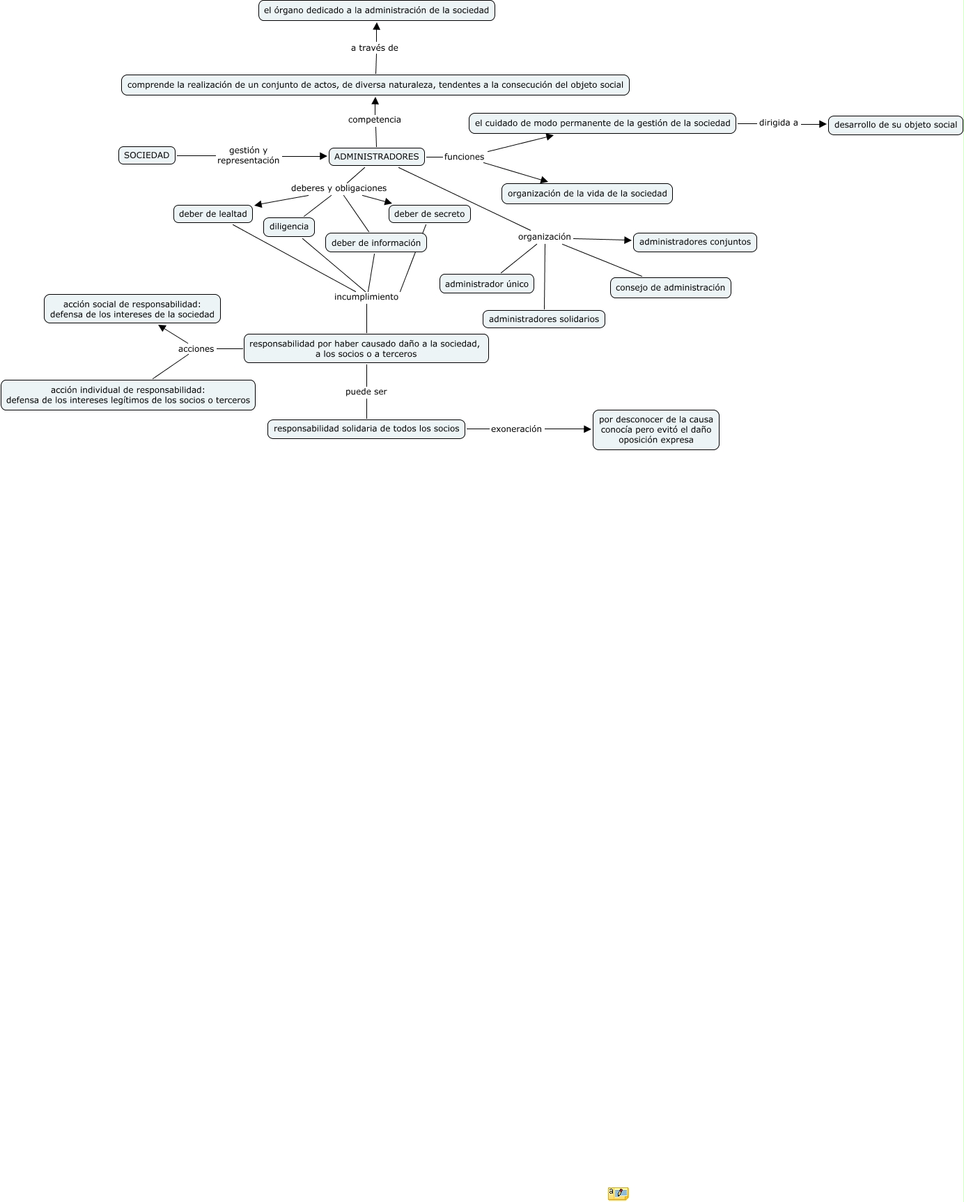 Este Cmap, tiene información relacionada con: escenario 10, el cuidado de modo permanente de la gestión de la sociedad dirigida a desarrollo de su objeto social, deber de secreto incumplimiento responsabilidad por haber causado daño a la sociedad, a los socios o a terceros, deber de lealtad incumplimiento responsabilidad por haber causado daño a la sociedad, a los socios o a terceros, responsabilidad por haber causado daño a la sociedad, a los socios o a terceros acciones acción individual de responsabilidad: defensa de los intereses legítimos de los socios o terceros, ADMINISTRADORES competencia comprende la realización de un conjunto de actos, de diversa naturaleza, tendentes a la consecución del objeto social, SOCIEDAD gestión y representación ADMINISTRADORES, ADMINISTRADORES organización administrador único, ADMINISTRADORES organización administradores conjuntos, deber de información incumplimiento responsabilidad por haber causado daño a la sociedad, a los socios o a terceros, responsabilidad solidaria de todos los socios exoneración por desconocer de la causa conocía pero evitó el daño oposición expresa, ADMINISTRADORES organización administradores solidarios, ADMINISTRADORES funciones el cuidado de modo permanente de la gestión de la sociedad, ADMINISTRADORES deberes y obligaciones deber de lealtad, comprende la realización de un conjunto de actos, de diversa naturaleza, tendentes a la consecución del objeto social a través de el órgano dedicado a la administración de la sociedad, ADMINISTRADORES deberes y obligaciones deber de información, responsabilidad por haber causado daño a la sociedad, a los socios o a terceros puede ser responsabilidad solidaria de todos los socios, responsabilidad por haber causado daño a la sociedad, a los socios o a terceros acciones acción social de responsabilidad: defensa de los intereses de la sociedad, ADMINISTRADORES funciones organización de la vida de la sociedad, ADMINISTRADORES deberes y obligaciones deber de secreto, ADMINISTRADORES organización consejo de administración