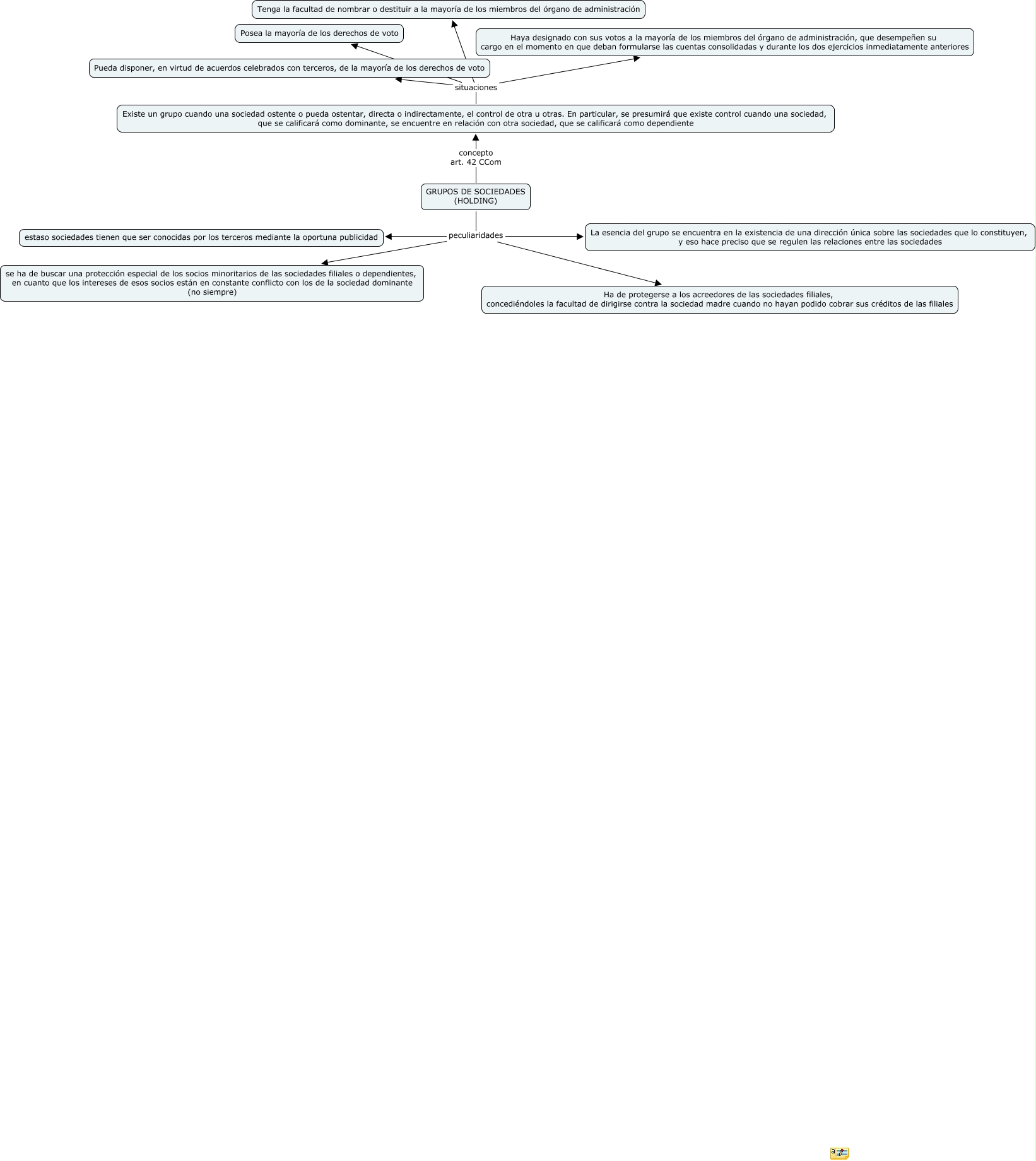 Este Cmap, tiene información relacionada con: escenario 11.2, Existe un grupo cuando una sociedad ostente o pueda ostentar, directa o indirectamente, el control de otra u otras. En particular, se presumirá que existe control cuando una sociedad, que se calificará como dominante, se encuentre en relación con otra sociedad, que se calificará como dependiente situaciones Pueda disponer, en virtud de acuerdos celebrados con terceros, de la mayoría de los derechos de voto, GRUPOS DE SOCIEDADES (HOLDING) concepto art. 42 CCom Existe un grupo cuando una sociedad ostente o pueda ostentar, directa o indirectamente, el control de otra u otras. En particular, se presumirá que existe control cuando una sociedad, que se calificará como dominante, se encuentre en relación con otra sociedad, que se calificará como dependiente, Existe un grupo cuando una sociedad ostente o pueda ostentar, directa o indirectamente, el control de otra u otras. En particular, se presumirá que existe control cuando una sociedad, que se calificará como dominante, se encuentre en relación con otra sociedad, que se calificará como dependiente situaciones Tenga la facultad de nombrar o destituir a la mayoría de los miembros del órgano de administración, Existe un grupo cuando una sociedad ostente o pueda ostentar, directa o indirectamente, el control de otra u otras. En particular, se presumirá que existe control cuando una sociedad, que se calificará como dominante, se encuentre en relación con otra sociedad, que se calificará como dependiente situaciones Posea la mayoría de los derechos de voto, GRUPOS DE SOCIEDADES (HOLDING) peculiaridades estaso sociedades tienen que ser conocidas por los terceros mediante la oportuna publicidad, GRUPOS DE SOCIEDADES (HOLDING) peculiaridades se ha de buscar una protección especial de los socios minoritarios de las sociedades filiales o dependientes, en cuanto que los intereses de esos socios están en constante conflicto con los de la sociedad dominante (no siempre), Existe un grupo cuando una sociedad ostente o pueda ostentar, directa o indirectamente, el control de otra u otras. En particular, se presumirá que existe control cuando una sociedad, que se calificará como dominante, se encuentre en relación con otra sociedad, que se calificará como dependiente situaciones Haya designado con sus votos a la mayoría de los miembros del órgano de administración, que desempeñen su cargo en el momento en que deban formularse las cuentas consolidadas y durante los dos ejercicios inmediatamente anteriores, GRUPOS DE SOCIEDADES (HOLDING) peculiaridades La esencia del grupo se encuentra en la existencia de una dirección única sobre las sociedades que lo constituyen, y eso hace preciso que se regulen las relaciones entre las sociedades, GRUPOS DE SOCIEDADES (HOLDING) peculiaridades Ha de protegerse a los acreedores de las sociedades filiales, concediéndoles la facultad de dirigirse contra la sociedad madre cuando no hayan podido cobrar sus créditos de las filiales