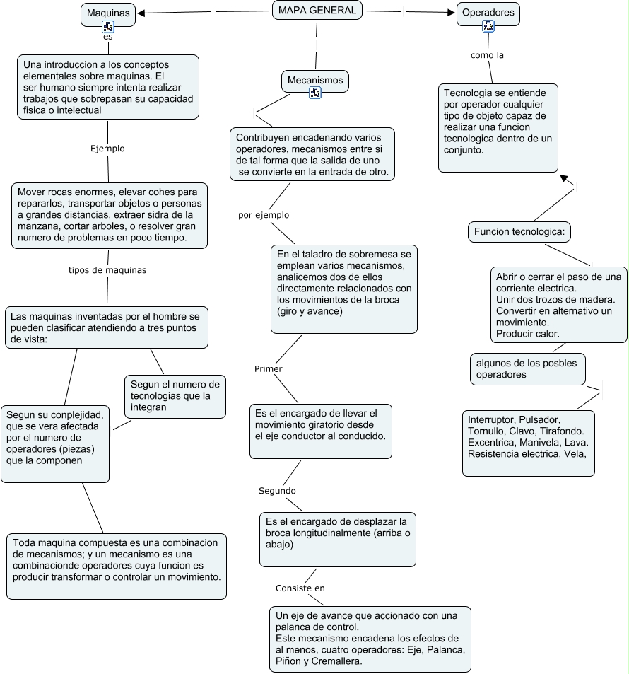 Este Cmap, tiene información relacionada con: mapa general de luis david quevedo yee- bayron diaz lopez, MAPA GENERAL Mecanismos, Funcion tecnologica: Abrir o cerrar el paso de una corriente electrica. Unir dos trozos de madera. Convertir en alternativo un movimiento. Producir calor., Funcion tecnologica: Tecnologia se entiende por operador cualquier tipo de objeto capaz de realizar una funcion tecnologica dentro de un conjunto., Abrir o cerrar el paso de una corriente electrica. Unir dos trozos de madera. Convertir en alternativo un movimiento. Producir calor. ???? algunos de los posbles operadores, Contribuyen encadenando varios operadores, mecanismos entre si de tal forma que la salida de uno se convierte en la entrada de otro. por ejemplo En el taladro de sobremesa se emplean varios mecanismos, analicemos dos de ellos directamente relacionados con los movimientos de la broca (giro y avance), Mecanismos Contribuyen encadenando varios operadores, mecanismos entre si de tal forma que la salida de uno se convierte en la entrada de otro., Operadores como la Tecnologia se entiende por operador cualquier tipo de objeto capaz de realizar una funcion tecnologica dentro de un conjunto., Maquinas es Una introduccion a los conceptos elementales sobre maquinas. El ser humano siempre intenta realizar trabajos que sobrepasan su capacidad fisica o intelectual, Segun su conplejidad, que se vera afectada por el numero de operadores (piezas) que la componen ???? Toda maquina compuesta es una combinacion de mecanismos; y un mecanismo es una combinacionde operadores cuya funcion es producir transformar o controlar un movimiento., Es el encargado de desplazar la broca longitudinalmente (arriba o abajo) Consiste en Un eje de avance que accionado con una palanca de control. Este mecanismo encadena los efectos de al menos, cuatro operadores: Eje, Palanca, Piñon y Cremallera., Segun el numero de tecnologias que la integran Segun su conplejidad, que se vera afectada por el numero de operadores (piezas) que la componen, algunos de los posbles operadores Interruptor, Pulsador, Tornullo, Clavo, Tirafondo. Excentrica, Manivela, Lava. Resistencia electrica, Vela,, Es el encargado de llevar el movimiento giratorio desde el eje conductor al conducido. Segundo Es el encargado de desplazar la broca longitudinalmente (arriba o abajo), Las maquinas inventadas por el hombre se pueden clasificar atendiendo a tres puntos de vista: ???? Segun el numero de tecnologias que la integran, Una introduccion a los conceptos elementales sobre maquinas. El ser humano siempre intenta realizar trabajos que sobrepasan su capacidad fisica o intelectual Ejemplo Mover rocas enormes, elevar cohes para repararlos, transportar objetos o personas a grandes distancias, extraer sidra de la manzana, cortar arboles, o resolver gran numero de problemas en poco tiempo., En el taladro de sobremesa se emplean varios mecanismos, analicemos dos de ellos directamente relacionados con los movimientos de la broca (giro y avance) Primer Es el encargado de llevar el movimiento giratorio desde el eje conductor al conducido., MAPA GENERAL Operadores, Las maquinas inventadas por el hombre se pueden clasificar atendiendo a tres puntos de vista: ???? Segun su conplejidad, que se vera afectada por el numero de operadores (piezas) que la componen, MAPA GENERAL Maquinas, Mover rocas enormes, elevar cohes para repararlos, transportar objetos o personas a grandes distancias, extraer sidra de la manzana, cortar arboles, o resolver gran numero de problemas en poco tiempo. tipos de maquinas Las maquinas inventadas por el hombre se pueden clasificar atendiendo a tres puntos de vista: