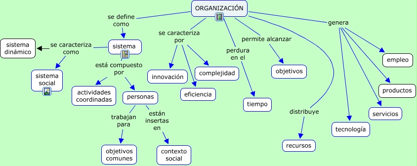 Este Cmap, tiene información relacionada con: Concepto y características de Organización, personas están insertas en contexto social, ORGANIZACIÓN se caracteriza por complejidad, ORGANIZACIÓN genera servicios, ORGANIZACIÓN genera productos, sistema se caracteriza como sistema dinámico, personas trabajan para objetivos comunes, ORGANIZACIÓN se define como sistema, sistema está compuesto por actividades coordinadas, ORGANIZACIÓN genera tecnología, ORGANIZACIÓN perdura en el tiempo, ORGANIZACIÓN se caracteriza por innovación, sistema está compuesto por personas, sistema se caracteriza como sistema social, ORGANIZACIÓN distribuye recursos, ORGANIZACIÓN permite alcanzar objetivos, ORGANIZACIÓN genera empleo, ORGANIZACIÓN se caracteriza por eficiencia