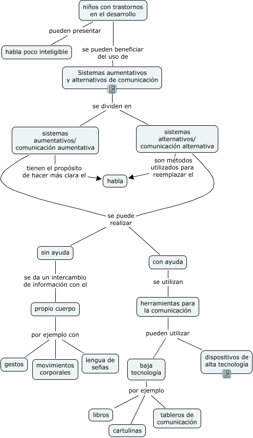 Este Cmap, tiene información relacionada con: Sistemas alternativos y aumentativos de comunicación, sistemas aumentativos/ comunicación aumentativa se puede realizar con ayuda, herramientas para la comunicación pueden utilizar baja tecnología, sistemas alternativos/ comunicación alternativa se puede realizar con ayuda, sistemas aumentativos/ comunicación aumentativa tienen el propósito de hacer más clara el habla, con ayuda se utilizan herramientas para la comunicación, propio cuerpo por ejemplo con gestos, sin ayuda se da un intercambio de información con el propio cuerpo, sistemas alternativos/ comunicación alternativa son métodos utilizados para reemplazar el habla, Sistemas aumentativos y alternativos de comunicación se dividen en sistemas alternativos/ comunicación alternativa, propio cuerpo por ejemplo con movimientos corporales, baja tecnología por ejemplo tableros de comunicación, baja tecnología por ejemplo libros, propio cuerpo por ejemplo con lengua de señas, Sistemas aumentativos y alternativos de comunicación se dividen en sistemas aumentativos/ comunicación aumentativa, niños con trastornos en el desarrollo se pueden beneficiar del uso de Sistemas aumentativos y alternativos de comunicación, herramientas para la comunicación pueden utilizar dispositivos de alta tecnología, sistemas alternativos/ comunicación alternativa se puede realizar sin ayuda, baja tecnología por ejemplo cartulinas, niños con trastornos en el desarrollo pueden presentar habla poco inteligible, sistemas aumentativos/ comunicación aumentativa se puede realizar sin ayuda