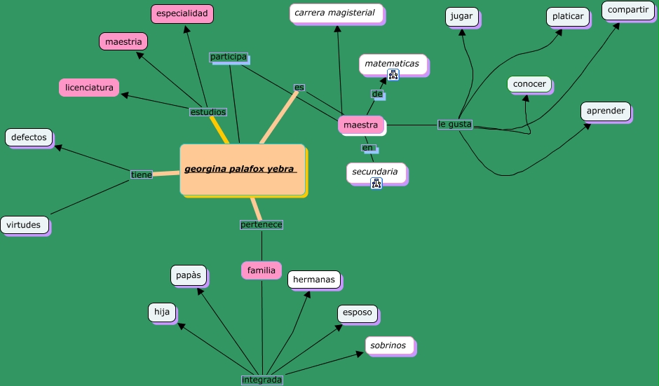 Este Cmap, tiene información relacionada con: en personal, maestra le gusta compartir, familia integrada papàs, maestra le gusta aprender, maestra le gusta jugar, georgina palafox yebra es maestra, maestra le gusta conocer, familia integrada esposo, georgina palafox yebra estudios licenciatura, georgina palafox yebra estudios maestria, georgina palafox yebra estudios especialidad, familia integrada hija, georgina palafox yebra pertenece familia, familia integrada sobrinos, familia integrada hermanas, georgina palafox yebra tiene defectos, maestra le gusta platicar, maestra de matematicas, georgina palafox yebra participa carrera magisterial, georgina palafox yebra tiene virtudes, maestra en secundaria