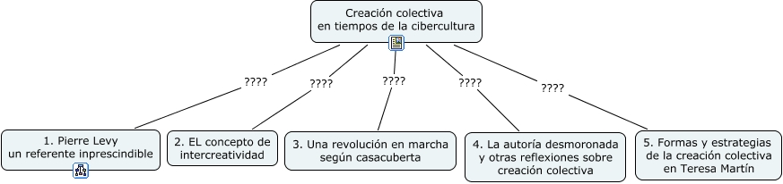 Este Cmap, tiene información relacionada con: Creación colectiva en tiempos de la Cibercultura, Creación colectiva en tiempos de la cibercultura ???? 2. EL concepto de intercreatividad, Creación colectiva en tiempos de la cibercultura ???? 3. Una revolución en marcha según casacuberta, Creación colectiva en tiempos de la cibercultura ???? 4. La autoría desmoronada y otras reflexiones sobre creación colectiva, Creación colectiva en tiempos de la cibercultura ???? 5. Formas y estrategias de la creación colectiva en Teresa Martín, Creación colectiva en tiempos de la cibercultura ???? 1. Pierre Levy un referente inprescindible