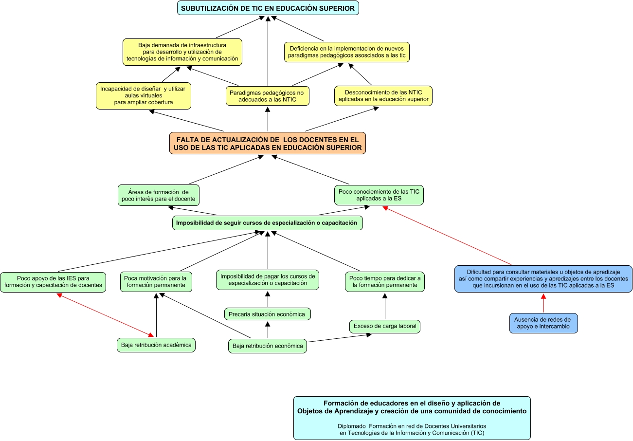 arbol de problemas 5 SIMPLIFICADO DOCENTE, Baja retribución académica Poca motivación para la formación permanente, Poco conociemiento de las TIC aplicadas a la ES FALTA DE ACTUALIZACIÓN DE LOS DOCENTES EN EL USO DE LAS TIC APLICADAS EN EDUCACIÓN SUPERIOR, Imposibilidad de pagar los cursos de especialización o capacitación Imposibilidad de seguir cursos de especialización o capacitación, FALTA DE ACTUALIZACIÓN DE LOS DOCENTES EN EL USO DE LAS TIC APLICADAS EN EDUCACIÓN SUPERIOR Paradigmas pedagógicos no adecuados a las NTIC, Poco apoyo de las IES para formación y capacitación de docentes Imposibilidad de seguir cursos de especialización o capacitación, Poco apoyo de las IES para formación y capacitación de docentes Baja retribución académica, Paradigmas pedagógicos no adecuados a las NTIC SUBUTILIZACIÓN DE TIC EN EDUCACIÓN SUPERIOR, Ausencia de redes de apoyo e intercambio Dificultad para consultar materiales u objetos de apredizaje así como compartir experiencias y apredizajes entre los docentes que incursionan en el uso de las TIC aplicadas a la ES, FALTA DE ACTUALIZACIÓN DE LOS DOCENTES EN EL USO DE LAS TIC APLICADAS EN EDUCACIÓN SUPERIOR Desconocimiento de las NTIC aplicadas en la educación superior, Exceso de carga laboral Poco tiempo para dedicar a la formación permanente