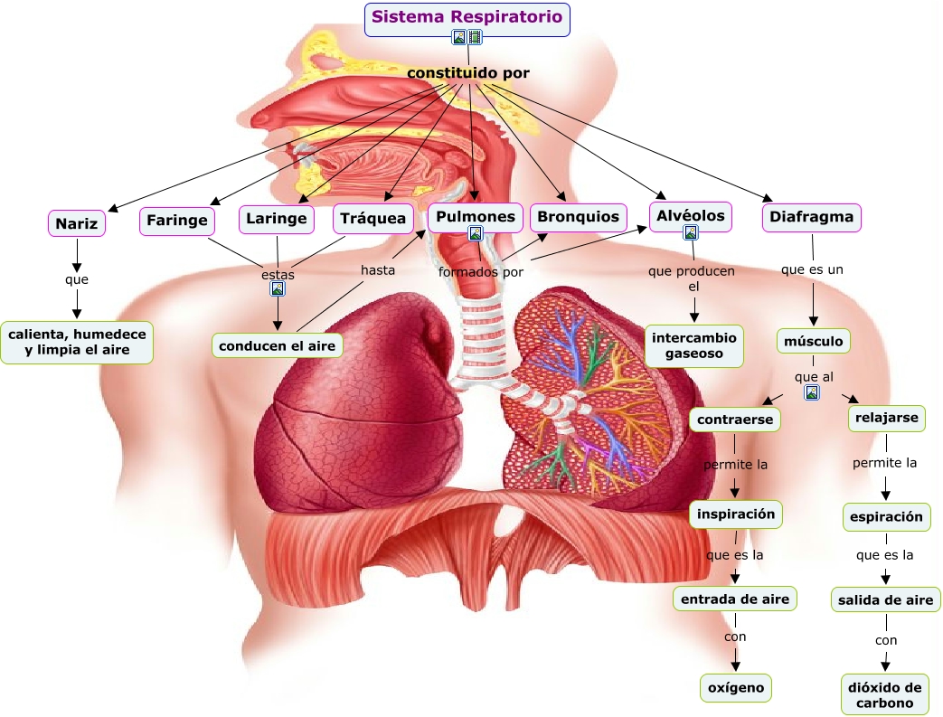 Este Cmap, tiene información relacionada con: sistema respiratorio, entrada de aire con oxígeno, Faringe estas conducen el aire, Sistema Respiratorio constituido por Bronquios, Sistema Respiratorio constituido por Pulmones, Pulmones formados por ????, Nariz que calienta, humedece y limpia el aire, Sistema Respiratorio constituido por Faringe, músculo que al relajarse, inspiración que es la entrada de aire, Sistema Respiratorio constituido por Laringe, Sistema Respiratorio constituido por Diafragma, Diafragma que es un músculo, Sistema Respiratorio constituido por Tráquea, relajarse permite la espiración, Alvéolos que producen el intercambio gaseoso, Sistema Respiratorio constituido por Alvéolos, músculo que al contraerse, Tráquea estas conducen el aire, Pulmones formados por Alvéolos, contraerse permite la inspiración