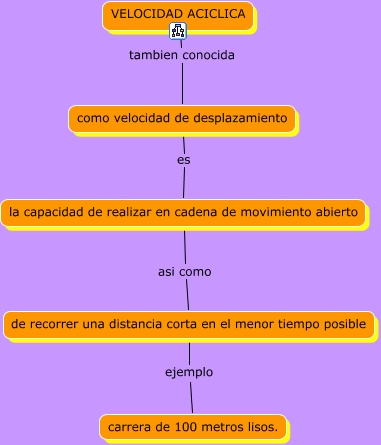 Este Cmap, tiene información relacionada con: VELOCIDAD ACICLICA, VELOCIDAD ACICLICA tambien conocida como velocidad de desplazamiento, la capacidad de realizar en cadena de movimiento abierto asi como de recorrer una distancia corta en el menor tiempo posible, de recorrer una distancia corta en el menor tiempo posible ejemplo carrera de 100 metros lisos., como velocidad de desplazamiento es la capacidad de realizar en cadena de movimiento abierto