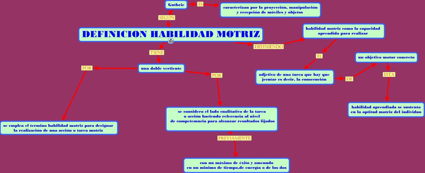 Este Cmap, tiene información relacionada con: definicion de habilidad motriz, una doble vertiente por se considera el lado cualitativo de la tarea o acción haciendo referencia al nivel de competemncia para alcanzar resultados fijados, una doble vertiente por se emplea el termino habilidad motriz para decignar la realización de una acción o tarea motriz, un objetivo motor concreto esta habilidad aprendiada se sustenta en la aptitud motriz del individuo, habilidad motriz como la capacidad aprendida para realizar el odjetivo de una tarea que hay que jecutar es decir, la consecución, DEFINICION HABILIDAD MOTRIZ tiene una doble vertiente, odjetivo de una tarea que hay que jecutar es decir, la consecución de un objetivo motor concreto, se considera el lado cualitativo de la tarea o acción haciendo referencia al nivel de competemncia para alcanzar resultados fijados previamente con un máximo de éxito y amenudo en un minimo de tiempo,de energía o de los dos, DEFINICION HABILIDAD MOTRIZ definiendo habilidad motriz como la capacidad aprendida para realizar, DEFINICION HABILIDAD MOTRIZ segun Guthrie, Guthrie es caracterizan por la proyección, manipulación y recepción de móviles y objetos
