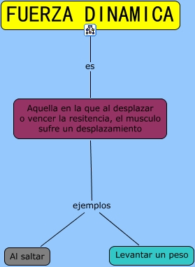 Este Cmap, tiene información relacionada con: fuerza dinamica, Aquella en la que al desplazar o vencer la resitencia, el musculo sufre un desplazamiento ejemplos Al saltar, FUERZA DINAMICA es Aquella en la que al desplazar o vencer la resitencia, el musculo sufre un desplazamiento, Aquella en la que al desplazar o vencer la resitencia, el musculo sufre un desplazamiento ejemplos Levantar un peso