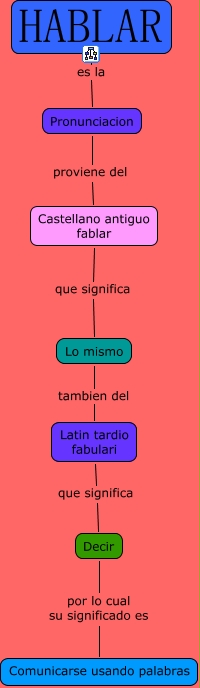 Este Cmap, tiene información relacionada con: hablar, Decir por lo cual su significado es Comunicarse usando palabras, Latin tardio fabulari que significa Decir, Lo mismo tambien del Latin tardio fabulari, HABLAR es la Pronunciacion, Pronunciacion proviene del Castellano antiguo fablar, Castellano antiguo fablar que significa Lo mismo