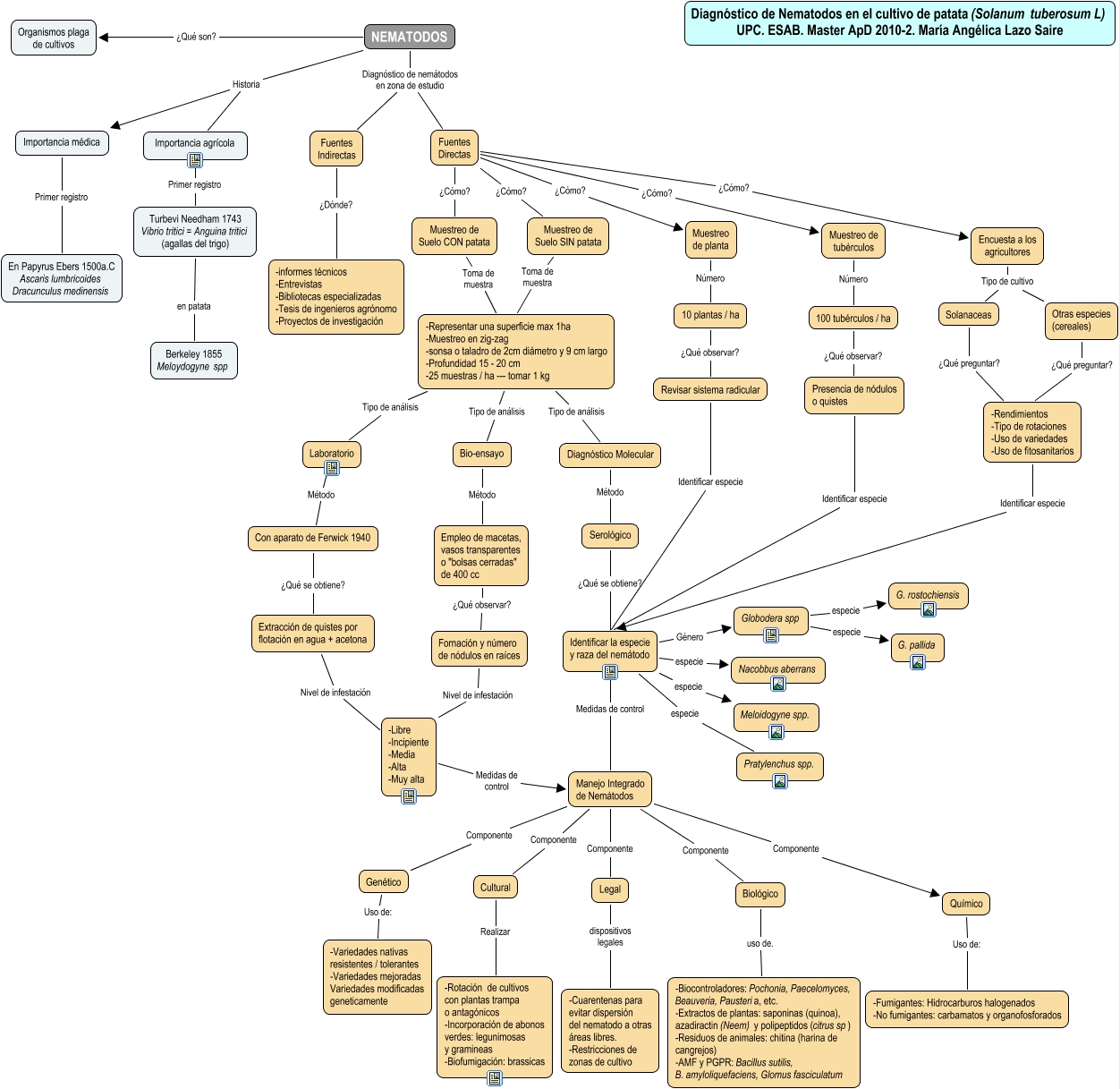 Este Cmap, tiene información relacionada con: Diagnóstico de Nemátodos en patata, Químico Uso de: -Fumigantes: Hidrocarburos halogenados -No fumigantes: carbamatos y organofosforados, Manejo Integrado de Nemátodos Componente Legal, Genético Uso de: -Variedades nativas resistentes / tolerantes -Variedades mejoradas Variedades modificadas geneticamente, Turbevi Needham 1743 Vibrio tritici = Anguina tritici (agallas del trigo) en patata Berkeley 1855 Meloydogyne spp, NEMATODOS Diagnóstico de nemátodos en zona de estudio Fuentes Indirectas, 100 tubérculos / ha ¿Qué observar? Presencia de nódulos o quistes, Identificar la especie y raza del nemátodo especie Nacobbus aberrans, -Representar una superficie max 1ha -Muestreo en zig-zag -sonsa o taladro de 2cm diámetro y 9 cm largo -Profundidad 15 - 20 cm -25 muestras / ha --- tomar 1 kg Tipo de análisis Diagnóstico Molecular, Encuesta a los agricultores Tipo de cultivo Otras especies (cereales), Fuentes Directas ¿Cómo? Muestreo de Suelo CON patata, Globodera spp especie G. pallida, Bio-ensayo Método Empleo de macetas, vasos transparentes o "bolsas cerradas" de 400 cc, Manejo Integrado de Nemátodos Componente Biológico, NEMATODOS ¿Qué son? Organismos plaga de cultivos, Fornación y número de nódulos en raíces Nivel de infestación -Libre -Incipiente -Media -Alta -Muy alta, Fuentes Directas ¿Cómo? Muestreo de tubérculos, Revisar sistema radicular Identificar especie Identificar la especie y raza del nemátodo, Identificar la especie y raza del nemátodo especie Meloidogyne spp., -Libre -Incipiente -Media -Alta -Muy alta Medidas de control Manejo Integrado de Nemátodos, -Rendimientos -Tipo de rotaciones -Uso de variedades -Uso de fitosanitarios Identificar especie Identificar la especie y raza del nemátodo