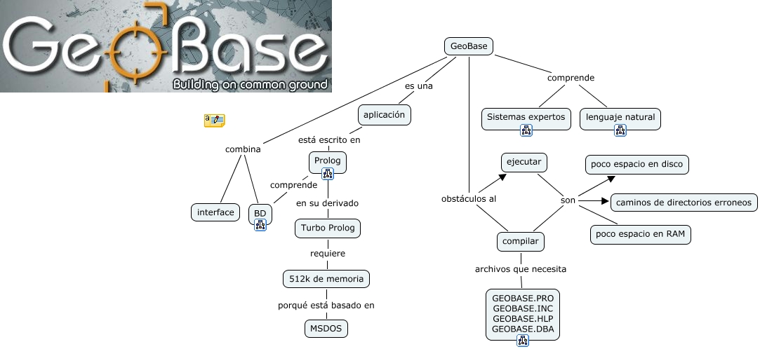 Este Cmap, tiene información relacionada con: GeoBase, GeoBase obstáculos al ejecutar, aplicación está escrito en Prolog, 512k de memoria porqué está basado en MSDOS, GeoBase comprende lenguaje natural, Turbo Prolog requiere 512k de memoria, ejecutar son caminos de directorios erroneos, GeoBase es una aplicación, ejecutar son poco espacio en disco, GeoBase obstáculos al compilar, ejecutar son poco espacio en RAM, compilar son poco espacio en RAM, GeoBase comprende Sistemas expertos, compilar son poco espacio en disco, GeoBase combina BD, GeoBase combina interface, compilar son caminos de directorios erroneos, compilar archivos que necesita GEOBASE.PRO GEOBASE.INC GEOBASE.HLP GEOBASE.DBA, Prolog en su derivado Turbo Prolog, Prolog comprende BD