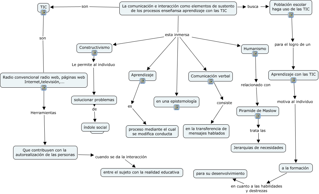 Este Cmap, tiene información relacionada con: La comunicación, La comunicación e interacción como elementos de sustento de los procesos enseñansa aprendizaje con las TIC son TIC, La comunicación e interacción como elementos de sustento de los procesos enseñansa aprendizaje con las TIC busca Población escolar haga uso de las TIC, Piramide de Maslow trata las Jerarquias de necesidades, Que contribuyen con la autorealización de las personas cuando se da la interacción entre el sujeto con la realidad educativa, La comunicación e interacción como elementos de sustento de los procesos enseñansa aprendizaje con las TIC esta inmersa en una epistemología, Población escolar haga uso de las TIC para el logro de un Aprendizaje con las TIC, TIC son Radio convencional radio web, páginas web Internet,televisión,..., a la formación en cuanto a las habilidades y destrezas para su desenvolvimiento, Aprendizaje con las TIC motiva al individuo a la formación, Radio convencional radio web, páginas web Internet,televisión,... Herramientas Que contribuyen con la autorealización de las personas, La comunicación e interacción como elementos de sustento de los procesos enseñansa aprendizaje con las TIC esta inmersa Aprendizaje, Humanismo relacionado con Piramide de Maslow, Comunicación verbal consiste en la transferencia de mensajes hablados, Constructivismo Le permite al individuo solucionar problemas, La comunicación e interacción como elementos de sustento de los procesos enseñansa aprendizaje con las TIC esta inmersa Comunicación verbal, La comunicación e interacción como elementos de sustento de los procesos enseñansa aprendizaje con las TIC esta inmersa Constructivismo, solucionar problemas de índole social, La comunicación e interacción como elementos de sustento de los procesos enseñansa aprendizaje con las TIC esta inmersa Humanismo, Aprendizaje es proceso mediante el cual se modifica conducta