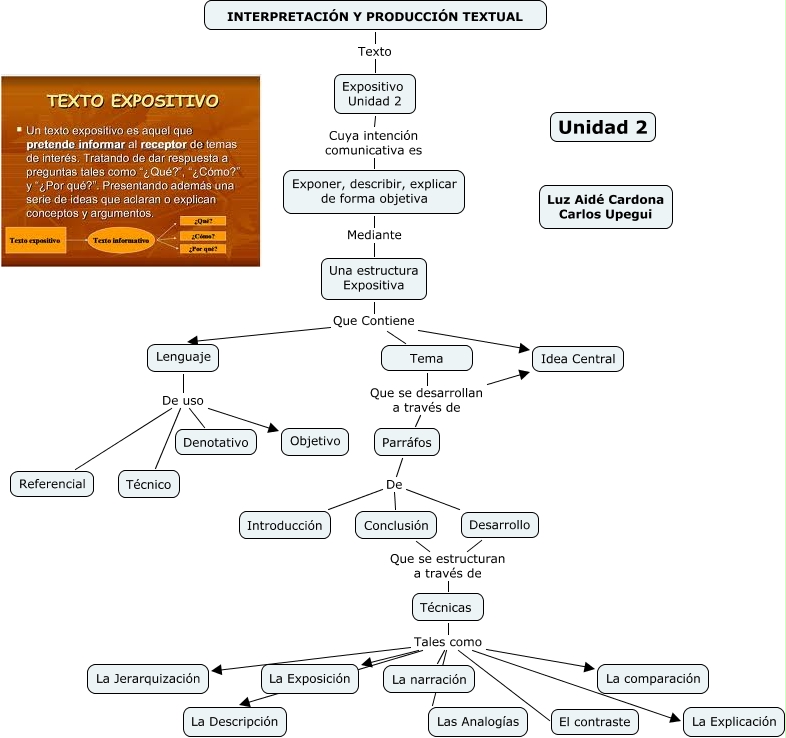 Este Cmap, tiene información relacionada con: Unidad 2 Expositivo, Parráfos De Conclusión, INTERPRETACIÓN Y PRODUCCIÓN TEXTUAL Texto Expositivo Unidad 2, Parráfos De Desarrollo, Tema Que se desarrollan a través de Idea Central, Técnicas Tales como El contraste, Lenguaje De uso Objetivo, Técnicas Tales como La Descripción, Desarrollo Que se estructuran a través de Técnicas, Lenguaje De uso Referencial, Lenguaje De uso Denotativo, Exponer, describir, explicar de forma objetiva Mediante Una estructura Expositiva, Conclusión Que se estructuran a través de Técnicas, Técnicas Tales como La narración, Técnicas Tales como La Jerarquización, Técnicas Tales como Las Analogías, Técnicas Tales como La Explicación, Técnicas Tales como La Exposición, Expositivo Unidad 2 Cuya intención comunicativa es Exponer, describir, explicar de forma objetiva, Una estructura Expositiva Que Contiene Idea Central, Técnicas Tales como La comparación
