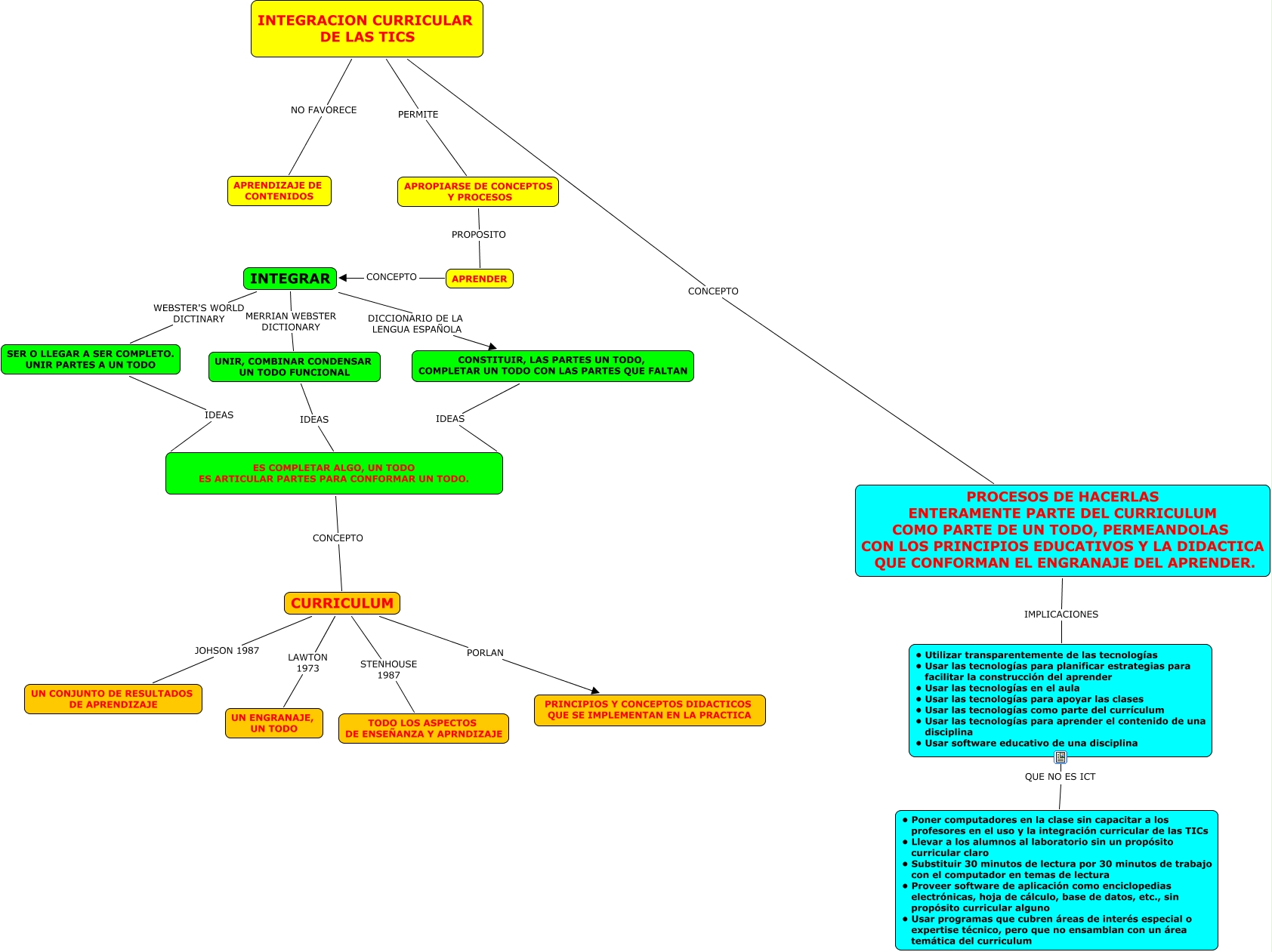 Este Cmap, tiene información relacionada con: INTEGRACION CURRICULAR DE LAS TICS, CONSTITUIR, LAS PARTES UN TODO, COMPLETAR UN TODO CON LAS PARTES QUE FALTAN IDEAS ES COMPLETAR ALGO, UN TODO ES ARTICULAR PARTES PARA CONFORMAR UN TODO., APROPIARSE DE CONCEPTOS Y PROCESOS PROPOSITO APRENDER, INTEGRACION CURRICULAR DE LAS TICS NO FAVORECE APRENDIZAJE DE CONTENIDOS, CURRICULUM STENHOUSE 1987 TODO LOS ASPECTOS DE ENSEÑANZA Y APRNDIZAJE, APRENDER CONCEPTO INTEGRAR, CURRICULUM LAWTON 1973 UN ENGRANAJE, UN TODO, CURRICULUM PORLAN PRINCIPIOS Y CONCEPTOS DIDACTICOS QUE SE IMPLEMENTAN EN LA PRACTICA, CURRICULUM JOHSON 1987 UN CONJUNTO DE RESULTADOS DE APRENDIZAJE, INTEGRAR MERRIAN WEBSTER DICTIONARY UNIR, COMBINAR CONDENSAR UN TODO FUNCIONAL, INTEGRAR DICCIONARIO DE LA LENGUA ESPAÑOLA CONSTITUIR, LAS PARTES UN TODO, COMPLETAR UN TODO CON LAS PARTES QUE FALTAN, SER O LLEGAR A SER COMPLETO. UNIR PARTES A UN TODO IDEAS ES COMPLETAR ALGO, UN TODO ES ARTICULAR PARTES PARA CONFORMAR UN TODO., ES COMPLETAR ALGO, UN TODO ES ARTICULAR PARTES PARA CONFORMAR UN TODO. CONCEPTO CURRICULUM, INTEGRACION CURRICULAR DE LAS TICS PERMITE APROPIARSE DE CONCEPTOS Y PROCESOS, INTEGRAR WEBSTER'S WORLD DICTINARY SER O LLEGAR A SER COMPLETO. UNIR PARTES A UN TODO, PROCESOS DE HACERLAS ENTERAMENTE PARTE DEL CURRICULUM COMO PARTE DE UN TODO, PERMEANDOLAS CON LOS PRINCIPIOS EDUCATIVOS Y LA DIDACTICA QUE CONFORMAN EL ENGRANAJE DEL APRENDER. IMPLICACIONES • Utilizar transparentemente de las tecnologías • Usar las tecnologías para planificar estrategias para facilitar la construcción del aprender • Usar las tecnologías en el aula • Usar las tecnologías para apoyar las clases • Usar las tecnologías como parte del currículum • Usar las tecnologías para aprender el contenido de una disciplina • Usar software educativo de una disciplina, UNIR, COMBINAR CONDENSAR UN TODO FUNCIONAL IDEAS ES COMPLETAR ALGO, UN TODO ES ARTICULAR PARTES PARA CONFORMAR UN TODO., INTEGRACION CURRICULAR DE LAS TICS CONCEPTO PROCESOS DE HACERLAS ENTERAMENTE PARTE DEL CURRICULUM COMO PARTE DE UN TODO, PERMEANDOLAS CON LOS PRINCIPIOS EDUCATIVOS Y LA DIDACTICA QUE CONFORMAN EL ENGRANAJE DEL APRENDER., • Utilizar transparentemente de las tecnologías • Usar las tecnologías para planificar estrategias para facilitar la construcción del aprender • Usar las tecnologías en el aula • Usar las tecnologías para apoyar las clases • Usar las tecnologías como parte del currículum • Usar las tecnologías para aprender el contenido de una disciplina • Usar software educativo de una disciplina QUE NO ES ICT • Poner computadores en la clase sin capacitar a los profesores en el uso y la integración curricular de las TICs • Llevar a los alumnos al laboratorio sin un propósito curricular claro • Substituir 30 minutos de lectura por 30 minutos de trabajo con el computador en temas de lectura • Proveer software de aplicación como enciclopedias electrónicas, hoja de cálculo, base de datos, etc., sin propósito curricular alguno • Usar programas que cubren áreas de interés especial o expertise técnico, pero que no ensamblan con un área temática del curriculum