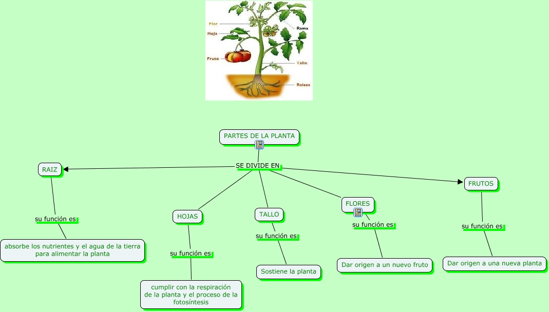 Este Cmap, tiene información relacionada con: partes de la planta, PARTES DE LA PLANTA SE DIVIDE EN FRUTOS, PARTES DE LA PLANTA SE DIVIDE EN TALLO, PARTES DE LA PLANTA SE DIVIDE EN HOJAS, PARTES DE LA PLANTA SE DIVIDE EN RAIZ, FRUTOS su función es Dar origen a una nueva planta, TALLO su función es Sostiene la planta, HOJAS su función es cumplir con la respiración de la planta y el proceso de la fotosíntesis, RAIZ su función es absorbe los nutrientes y el agua de la tierra para alimentar la planta, FLORES su función es Dar origen a un nuevo fruto, PARTES DE LA PLANTA SE DIVIDE EN FLORES