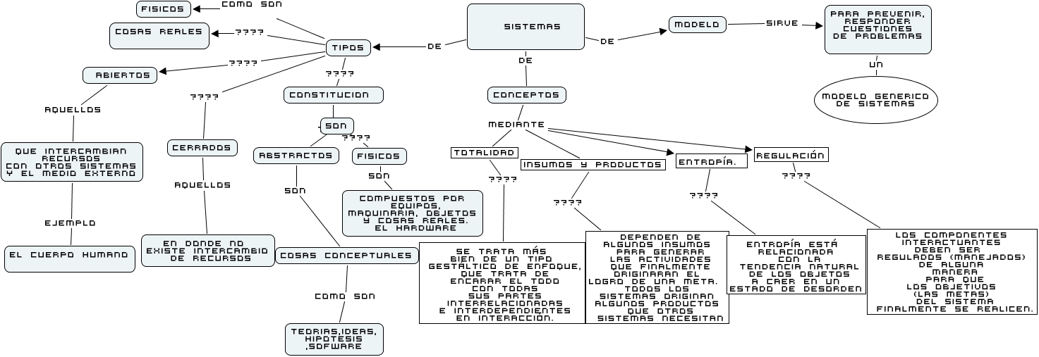 Este Cmap, tiene información relacionada con: SISTEMAS, ABSTRACTOS SON COSAS CONCEPTUALES, MODELO SIRVE PARA PREVENIR, RESPONDER CUESTIONES DE PROBLEMAS, SON ???? FISICOS, TIPOS COMO SON FISICOS, TOTALIDAD ???? se trata más bien de un tipo gestáltico de enfoque, que trata de encarar el todo con todas sus partes interrelacionadas e interdependientes en interacción., CONCEPTOS MEDIANTE TOTALIDAD, CONSTITUCION ???? ABSTRACTOS, COSAS CONCEPTUALES COMO SON TEORIAS,IDEAS, HIPOTESIS ,SOFWARE, FISICOS SON compuestos por equipos, maquinaria, objetos y cosas reales. El hardware, TIPOS ???? CERRADOS, TIPOS ???? ABIERTOS, CONCEPTOS MEDIANTE Entropía., Entropía. ???? entropía está relacionada con la tendencia natural de los objetos a caer en un estado de desorden, CONCEPTOS MEDIANTE Regulación, TIPOS ???? CONSTITUCION, SISTEMAS DE CONCEPTOS, CONCEPTOS MEDIANTE Insumos y productos, QUE INTERCAMBIAN RECURSOS CON OTROS SISTEMAS Y EL MEDIO EXTERNO EJEMPLO EL CUERPO HUMANO, CERRADOS AQUELLOS EN DONDE NO EXISTE INTERCAMBIO DE RECURSOS, PARA PREVENIR, RESPONDER CUESTIONES DE PROBLEMAS UN MODELO GENERICO DE SISTEMAS