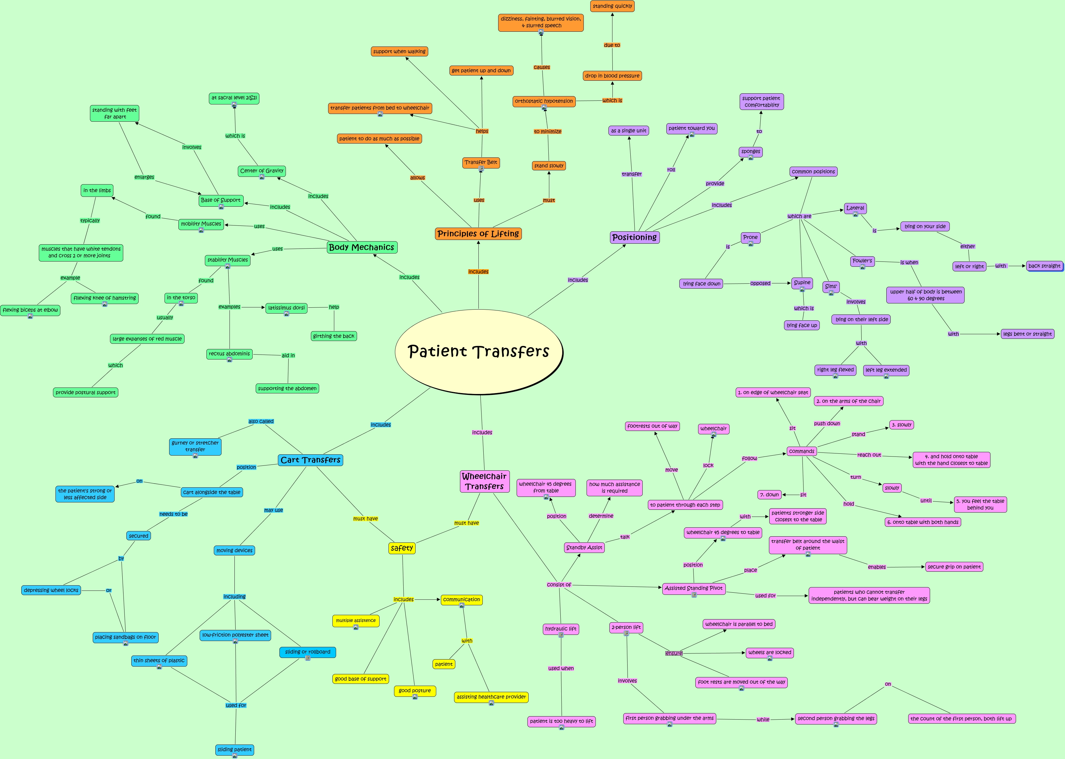 This Concept Map, created with IHMC CmapTools, has information related to: Danielle & Thi-Patient Transfers, Wheelchair Transfers consist of 2-person lift, second person grabbing the legs on the count of the first person, both lift up, upper half of body is between 60 & 90 degrees with legs bent or straight, commands turn slowly, commands sit 7. down, stand slowly to minimize orthostatic hypotension, Patient Transfers includes Wheelchair Transfers, standing with feet far apart enlarges Base of Support, drop in blood pressure due to standing quickly, Wheelchair Transfers consist of Standby Assist, communication with patient, low-friction polyester sheet used for sliding patient, 2-person lift ensure wheelchair is parallel to bed, Positioning includes common positions, common positions which are Lateral, rectus abdominis aid in supporting the abdomen, Cart Transfers position cart alongside the table, Cart Transfers must have safety, stability Muscles found in the torso, to patient through each step lock wheelchair