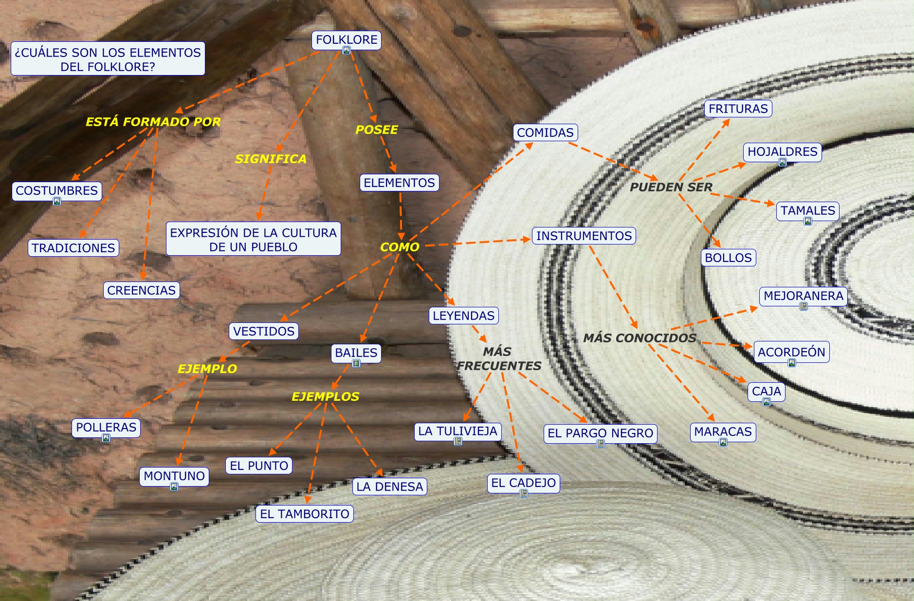 Este Cmap, tiene información relacionada con: elementos del folklore, COMIDAS PUEDEN SER TAMALES, INSTRUMENTOS MÁS CONOCIDOS ACORDEÓN, ELEMENTOS COMO VESTIDOS, FOLKLORE POSEE ELEMENTOS, VESTIDOS EJEMPLO POLLERAS, INSTRUMENTOS MÁS CONOCIDOS CAJA, LEYENDAS MÁS FRECUENTES EL PARGO NEGRO, ELEMENTOS COMO LEYENDAS, INSTRUMENTOS MÁS CONOCIDOS MARACAS, ELEMENTOS COMO COMIDAS, FOLKLORE ESTÁ FORMADO POR TRADICIONES, FOLKLORE ESTÁ FORMADO POR CREENCIAS, LEYENDAS MÁS FRECUENTES LA TULIVIEJA, FOLKLORE ESTÁ FORMADO POR COSTUMBRES, ELEMENTOS COMO BAILES, BAILES EJEMPLOS LA DENESA, LEYENDAS MÁS FRECUENTES EL CADEJO, COMIDAS PUEDEN SER HOJALDRES, COMIDAS PUEDEN SER FRITURAS, BAILES EJEMPLOS EL PUNTO