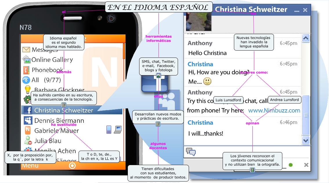 Este Cmap, tiene información relacionada con: español, Luis Lunsdford opinan Los jóvenes reconocen el contexto comunicacional y no utilizan bien la ortografía., Ha sufrido cambio en su escritura, a consecuencias de la tecnología. ha sustituido T o D, te, de., la ch en x, la LL es Y, EN EL IDIOMA ESPAÑOL el Idioma español es el segundo idioma mas hablado., Desarrollan nuevos modos y prácticas de escritura. algunos docentes Tienen dificultades con sus estudiantes, al momento de producir textos., EN EL IDIOMA ESPAÑOL las Nuevas tecnologías han invadido la lengua española, Ha sufrido cambio en su escritura, a consecuencias de la tecnología. ha sustituido X, por la preposición por, la q´, por la letra k, Nuevas tecnologías han invadido la lengua española autores como: Andrea Lunsford, EN EL IDIOMA ESPAÑOL herramientas informáticas SMS, chat, Twitter, e-mail, Facebook, blogs y fotologs, Idioma español es el segundo idioma mas hablado. además Ha sufrido cambio en su escritura, a consecuencias de la tecnología., Andrea Lunsford opinan Los jóvenes reconocen el contexto comunicacional y no utilizan bien la ortografía., SMS, chat, Twitter, e-mail, Facebook, blogs y fotologs ellas Desarrollan nuevos modos y prácticas de escritura., Nuevas tecnologías han invadido la lengua española autores como: Luis Lunsdford