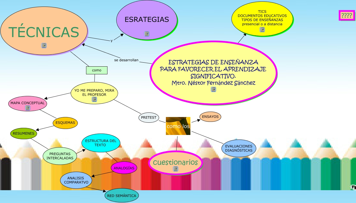 Este Cmap, tiene información relacionada con: estrategia de enseñanza_fonseca, MAPA CONCEPTUAL ???? ESQUEMAS, ANALISIS COMPARATVO ???? RED SEMÁNTICA, YO ME PREPARO, MIRA EL PROFESOR ???? MAPA CONCEPTUAL, ESTRATEGIAS DE ENSEÑANZA PARA FAVORECER EL APRENDIZAJE SIGNIFICATIVO. Mtro. Néstor Fernández Sánchez ???? ????, TÉCNICAS y ESRATEGIAS, ESTRUCTURA DEL TEXTO ???? ANALOGÍAS, PRETEST como los EVALUACIONES DIAGNÓSTICAS, ESTRATEGIAS DE ENSEÑANZA PARA FAVORECER EL APRENDIZAJE SIGNIFICATIVO. Mtro. Néstor Fernández Sánchez se desarrollan TÉCNICAS, PRETEST como los cuestionarios, YO ME PREPARO, MIRA EL PROFESOR ???? PRETEST, TÉCNICAS ???? YO ME PREPARO, MIRA EL PROFESOR, PREGUNTAS INTERCALADAS ???? ESTRUCTURA DEL TEXTO, RESUMENES ???? PREGUNTAS INTERCALADAS, ANALOGÍAS ???? ANALISIS COMPARATVO, PRETEST como los ENSAYOS, ESQUEMAS ???? RESUMENES