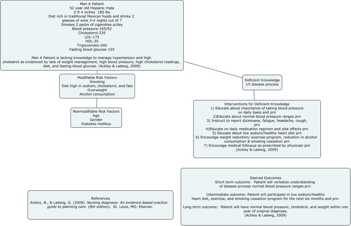 This Concept Map, created with IHMC CmapTools, has information related to: Henderson_CMAP, Nonmodifiable Risk Factors Age Gender Diabetes mellitus ???? Modifiable Risk Factors Smoking Diet high in sodium, cholesterol, and fats Overweight Alcohol consumption, Modifiable Risk Factors Smoking Diet high in sodium, cholesterol, and fats Overweight Alcohol consumption ???? Man A Patient 52 year old Hispanic male 5 ft 4 inches 185 lbs Diet rich in traditional Mexican foods and drinks 2 glasses of wine 3-4 nights out of 7 Smokes 2 packs of cigarettes p/day Blood pressure-165/92 Cholesterol-235 LDL-175 HDL-35 Triglycerides-240 Fasting blood glucose-155 Man A Patient is lacking knowledge to manage hypertension and high cholestrol as evidenced by lack of weight management, high blood pressure, high cholesterol readings, diet, and fasting blood glucose. (Ackley & Ladwig, 2009), Man A Patient 52 year old Hispanic male 5 ft 4 inches 185 lbs Diet rich in traditional Mexican foods and drinks 2 glasses of wine 3-4 nights out of 7 Smokes 2 packs of cigarettes p/day Blood pressure-165/92 Cholesterol-235 LDL-175 HDL-35 Triglycerides-240 Fasting blood glucose-155 Man A Patient is lacking knowledge to manage hypertension and high cholestrol as evidenced by lack of weight management, high blood pressure, high cholesterol readings, diet, and fasting blood glucose. (Ackley & Ladwig, 2009) ???? ????, Man A Patient 52 year old Hispanic male 5 ft 4 inches 185 lbs Diet rich in traditional Mexican foods and drinks 2 glasses of wine 3-4 nights out of 7 Smokes 2 packs of cigarettes p/day Blood pressure-165/92 Cholesterol-235 LDL-175 HDL-35 Triglycerides-240 Fasting blood glucose-155 Man A Patient is lacking knowledge to manage hypertension and high cholestrol as evidenced by lack of weight management, high blood pressure, high cholesterol readings, diet, and fasting blood glucose. (Ackley & Ladwig, 2009) ???? Interventions for Deficient Knowledge 1) Educate about importance of taking blood pressure on daily basis and prn 2)Educate about normal blood pressure ranges prn 3) Instruct to report dizzinuess, fatigue, headache, cough, prn 4)Educate on daily medication regimen and side effects prn 5) Educate about low sodium/healthy heart diet prn 6) Encourage weight reduction/ exercise program, reduction in alcohol consumption & smoking cessation prn 7) Encourage medical followup as prescribed by physician prn (Ackley & Ladwig, 2009), Modifiable Risk Factors Smoking Diet high in sodium, cholesterol, and fats Overweight Alcohol consumption ???? Man A Patient 52 year old Hispanic male 5 ft 4 inches 185 lbs Diet rich in traditional Mexican foods and drinks 2 glasses of wine 3-4 nights out of 7 Smokes 2 packs of cigarettes p/day Blood pressure-165/92 Cholesterol-235 LDL-175 HDL-35 Triglycerides-240 Fasting blood glucose-155 Man A Patient is lacking knowledge to manage hypertension and high cholestrol as evidenced by lack of weight management, high blood pressure, high cholesterol readings, diet, and fasting blood glucose. (Ackley & Ladwig, 2009), Man A Patient 52 year old Hispanic male 5 ft 4 inches 185 lbs Diet rich in traditional Mexican foods and drinks 2 glasses of wine 3-4 nights out of 7 Smokes 2 packs of cigarettes p/day Blood pressure-165/92 Cholesterol-235 LDL-175 HDL-35 Triglycerides-240 Fasting blood glucose-155 Man A Patient is lacking knowledge to manage hypertension and high cholestrol as evidenced by lack of weight management, high blood pressure, high cholesterol readings, diet, and fasting blood glucose. (Ackley & Ladwig, 2009) ???? Deficient Knowledge r/t disease process