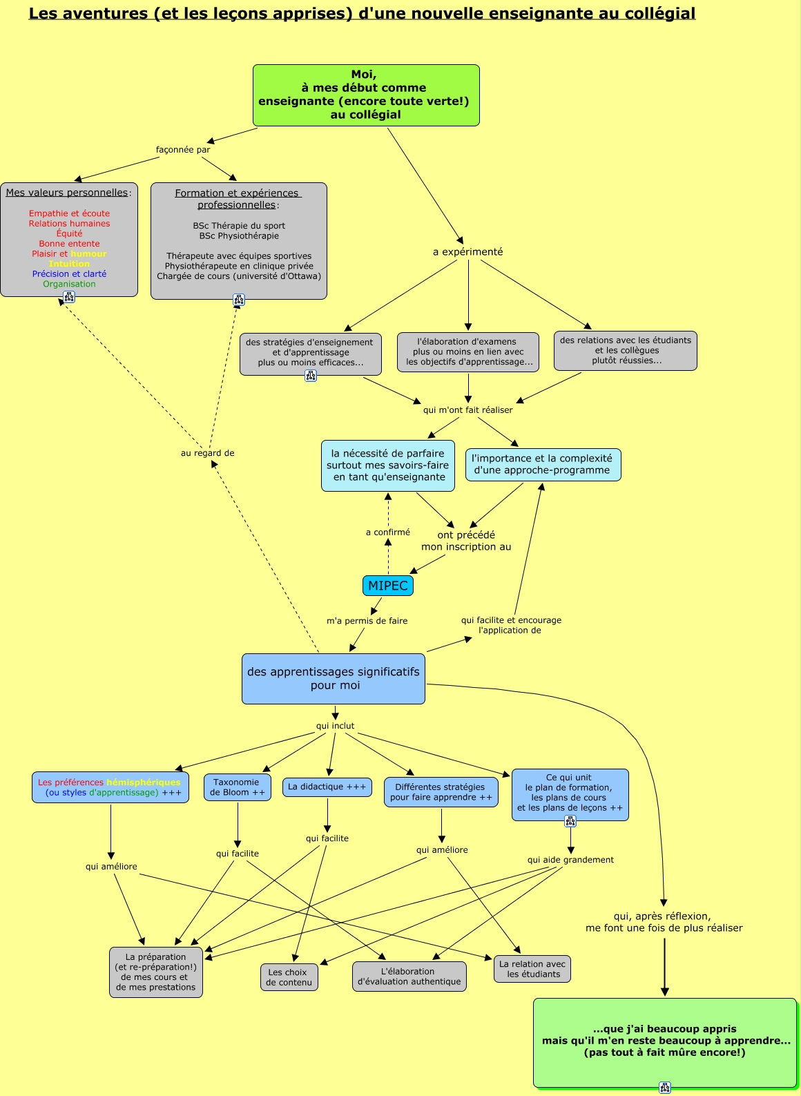 Cette carte de concepts créée avec IHMC CmapTools traite de: Réseau de concept MIPEC, Les préférences hémisphériques (ou styles d'apprentissage) +++ qui améliore La préparation (et re-préparation!) de mes cours et de mes prestations, Différentes stratégies pour faire apprendre ++ qui améliore La préparation (et re-préparation!) de mes cours et de mes prestations, la nécessité de parfaire surtout mes savoirs-faire en tant qu'enseignante ont précédé mon inscription au MIPEC, La didactique +++ qui facilite La préparation (et re-préparation!) de mes cours et de mes prestations, Ce qui unit le plan de formation, les plans de cours et les plans de leçons ++ qui aide grandement L'élaboration d'évaluation authentique, des apprentissages significatifs pour moi qui facilite et encourage l'application de l'importance et la complexité d'une approche-programme, Ce qui unit le plan de formation, les plans de cours et les plans de leçons ++ qui aide grandement Les choix de contenu, Taxonomie de Bloom ++ qui facilite L'élaboration d'évaluation authentique, La didactique +++ qui facilite Les choix de contenu, des apprentissages significatifs pour moi qui inclut Les préférences hémisphériques (ou styles d'apprentissage) +++, Moi, à mes début comme enseignante (encore toute verte!) au collégial façonnée par Mes valeurs personnelles: Empathie et écoute Relations humaines Équité Bonne entente Plaisir et humour Intuition Précision et clarté Organisation, des apprentissages significatifs pour moi qui inclut La didactique +++, des apprentissages significatifs pour moi qui inclut Différentes stratégies pour faire apprendre ++, Les préférences hémisphériques (ou styles d'apprentissage) +++ qui améliore La relation avec les étudiants, MIPEC a confirmé la nécessité de parfaire surtout mes savoirs-faire en tant qu'enseignante, des apprentissages significatifs pour moi qui inclut Ce qui unit le plan de formation, les plans de cours et les plans de leçons ++, Moi, à mes début comme enseignante (encore toute verte!) au collégial a expérimenté des relations avec les étudiants et les collègues plutôt réussies..., des stratégies d'enseignement et d'apprentissage plus ou moins efficaces... qui m'ont fait réaliser la nécessité de parfaire surtout mes savoirs-faire en tant qu'enseignante, l'élaboration d'examens plus ou moins en lien avec les objectifs d'apprentissage... qui m'ont fait réaliser la nécessité de parfaire surtout mes savoirs-faire en tant qu'enseignante, l'importance et la complexité d'une approche-programme ont précédé mon inscription au MIPEC