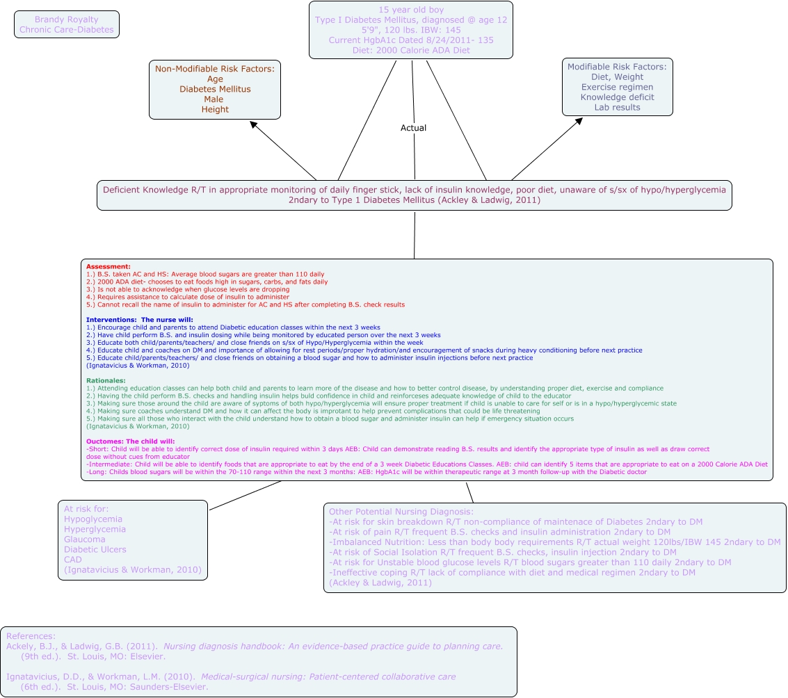 This Concept Map, created with IHMC CmapTools, has information related to: Brandy Royalty, 15 year old boy Type I Diabetes Mellitus, diagnosed @ age 12 5'9", 120 lbs. IBW: 145 Current HgbA1c Dated 8/24/2011- 135 Diet: 2000 Calorie ADA Diet ???? Modifiable Risk Factors: Diet, Weight Exercise regimen Knowledge deficit Lab results, 15 year old boy Type I Diabetes Mellitus, diagnosed @ age 12 5'9", 120 lbs. IBW: 145 Current HgbA1c Dated 8/24/2011- 135 Diet: 2000 Calorie ADA Diet ???? Non-Modifiable Risk Factors: Age Diabetes Mellitus Male Height, 15 year old boy Type I Diabetes Mellitus, diagnosed @ age 12 5'9", 120 lbs. IBW: 145 Current HgbA1c Dated 8/24/2011- 135 Diet: 2000 Calorie ADA Diet Actual Deficient Knowledge R/T in appropriate monitoring of daily finger stick, lack of insulin knowledge, poor diet, unaware of s/sx of hypo/hyperglycemia 2ndary to Type 1 Diabetes Mellitus (Ackley & Ladwig, 2011), Deficient Knowledge R/T in appropriate monitoring of daily finger stick, lack of insulin knowledge, poor diet, unaware of s/sx of hypo/hyperglycemia 2ndary to Type 1 Diabetes Mellitus (Ackley & Ladwig, 2011) ???? Assessment: 1.) B.S. taken AC and HS: Average blood sugars are greater than 110 daily 2.) 2000 ADA diet- chooses to eat foods high in sugars, carbs, and fats daily 3.) Is not able to acknowledge when glucose levels are dropping 4.) Requires assistance to calculate dose of insulin to administer 5.) Cannot recall the name of insulin to administer for AC and HS after completing B.S. check results Interventions: The nurse will: 1.) Encourage child and parents to attend Diabetic education classes within the next 3 weeks 2.) Have child perform B.S. and insulin dosing while being monitored by educated person over the next 3 weeks 3.) Educate both child/parents/teachers/ and close friends on s/sx of Hypo/Hyperglycemia within the week 4.) Educate child and coaches on DM and importance of allowing for rest periods/proper hydration/and encouragement of snacks during heavy conditioning before next practice 5.) Educate child/parents/teachers/ and close friends on obtaining a blood sugar and how to administer insulin injections before next practice (Ignatavicius & Workman, 2010) Rationales: 1.) Attending education classes can help both child and parents to learn more of the disease and how to better control disease, by understanding proper diet, exercise and compliance 2.) Having the child perform B.S. checks and handling insulin helps buld confidence in child and reinforceses adequate knowledge of child to the educator 3.) Making sure those around the child are aware of syptoms of both hypo/hyperglycemia will ensure proper treatment if child is unable to care for self or is in a hypo/hyperglycemic state 4.) Making sure coaches understand DM and how it can affect the body is improtant to help prevent complications that could be life threatening 5.) Making sure all those who interact with the child understand how to obtain a blood sugar and administer insulin can help if emergency situation occurs (Ignatavicius & Workman, 2010) Ouctomes: The child will: -Short: Child will be able to identify correct dose of insulin required within 3 days AEB: Child can demonstrate reading B.S. results and identify the appropriate type of insulin as well as draw correct dose without cues from educator -Intermediate: Child will be able to identify foods that are appropriate to eat by the end of a 3 week Diabetic Educations Classes. AEB: child can identify 5 items that are appropriate to eat on a 2000 Calorie ADA Diet -Long: Childs blood sugars will be within the 70-110 range within the next 3 months: AEB: HgbA1c will be within therapeutic range at 3 month follow-up with the Diabetic doctor, Assessment: 1.) B.S. taken AC and HS: Average blood sugars are greater than 110 daily 2.) 2000 ADA diet- chooses to eat foods high in sugars, carbs, and fats daily 3.) Is not able to acknowledge when glucose levels are dropping 4.) Requires assistance to calculate dose of insulin to administer 5.) Cannot recall the name of insulin to administer for AC and HS after completing B.S. check results Interventions: The nurse will: 1.) Encourage child and parents to attend Diabetic education classes within the next 3 weeks 2.) Have child perform B.S. and insulin dosing while being monitored by educated person over the next 3 weeks 3.) Educate both child/parents/teachers/ and close friends on s/sx of Hypo/Hyperglycemia within the week 4.) Educate child and coaches on DM and importance of allowing for rest periods/proper hydration/and encouragement of snacks during heavy conditioning before next practice 5.) Educate child/parents/teachers/ and close friends on obtaining a blood sugar and how to administer insulin injections before next practice (Ignatavicius & Workman, 2010) Rationales: 1.) Attending education classes can help both child and parents to learn more of the disease and how to better control disease, by understanding proper diet, exercise and compliance 2.) Having the child perform B.S. checks and handling insulin helps buld confidence in child and reinforceses adequate knowledge of child to the educator 3.) Making sure those around the child are aware of syptoms of both hypo/hyperglycemia will ensure proper treatment if child is unable to care for self or is in a hypo/hyperglycemic state 4.) Making sure coaches understand DM and how it can affect the body is improtant to help prevent complications that could be life threatening 5.) Making sure all those who interact with the child understand how to obtain a blood sugar and administer insulin can help if emergency situation occurs (Ignatavicius & Workman, 2010) Ouctomes: The child will: -Short: Child will be able to identify correct dose of insulin required within 3 days AEB: Child can demonstrate reading B.S. results and identify the appropriate type of insulin as well as draw correct dose without cues from educator -Intermediate: Child will be able to identify foods that are 