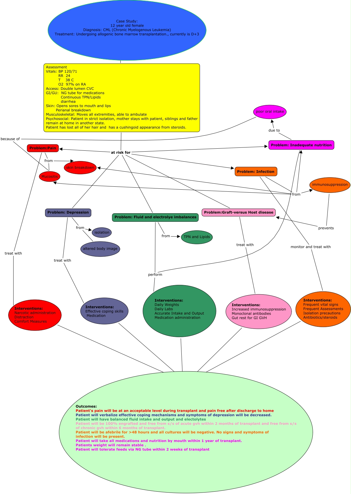 This Concept Map, created with IHMC CmapTools, has information related to: Novak_CML, Problem: Depression from altered body image, Problem:Pain from Mucositis, Problem: Infection from Mucositis, Assessment Vitals: BP 120/71 RR 24 T 38 C O2 97% on RA Access: Double lumen CVC GI/GU: NG tube for medications Continuous TPN/Lipids diarrhea Skin: Opens sores to mouth and lips Perianal breakdown Musculoskeletal: Moves all extremities, able to ambulate Psychosocial: Patient in strict isolation, mother stays with patient, siblings and father remain at home in another state. Patient has lost all of her hair and has a cushingoid appearance from steroids. at risk for Problem:Graft-versus Host disease, Problem:Pain treat with Interventions: Narcotic administration Distraction Comfort Measures, Assessment Vitals: BP 120/71 RR 24 T 38 C O2 97% on RA Access: Double lumen CVC GI/GU: NG tube for medications Continuous TPN/Lipids diarrhea Skin: Opens sores to mouth and lips Perianal breakdown Musculoskeletal: Moves all extremities, able to ambulate Psychosocial: Patient in strict isolation, mother stays with patient, siblings and father remain at home in another state. Patient has lost all of her hair and has a cushingoid appearance from steroids. at risk for Problem: Fluid and electrolye imbalances, Assessment Vitals: BP 120/71 RR 24 T 38 C O2 97% on RA Access: Double lumen CVC GI/GU: NG tube for medications Continuous TPN/Lipids diarrhea Skin: Opens sores to mouth and lips Perianal breakdown Musculoskeletal: Moves all extremities, able to ambulate Psychosocial: Patient in strict isolation, mother stays with patient, siblings and father remain at home in another state. Patient has lost all of her hair and has a cushingoid appearance from steroids. at risk for Problem: Depression, poor oral intake because of Mucositis, Assessment Vitals: BP 120/71 RR 24 T 38 C O2 97% on RA Access: Double lumen CVC GI/GU: NG tube for medications Continuous TPN/Lipids diarrhea Skin: Opens sores to mouth and lips Perianal breakdown Musculoskeletal: Moves all extremities, able to ambulate Psychosocial: Patient in strict isolation, mother stays with patient, siblings and father remain at home in another state. Patient has lost all of her hair and has a cushingoid appearance from steroids. at risk for Problem:Pain, Problem: Fluid and electrolye imbalances perform Interventions: Daily Weights Daily Labs Accurate Intake and Output Medication administration, Interventions: Daily Weights Daily Labs Accurate Intake and Output Medication administration leads to Outcomes: Patient's pain will be at an acceptable level during transplant and pain free after discharge to home Patient will verbalize effective coping mechanisms and symptoms of depression will be decreased. Patient will have balanced fluid intake and output and electolytes Patient will be 100% engrafted and free from s/s of acute gvh within 2 months of transplant and free from s/s of chronic gvh within 6 months of transplant. Patient will be afebrile for ᡨ hours and all cultures will be negative. No signs and symptoms of infection will be present. Patient will take all medications and nutrition by mouth within 1 year of transplant. Patients weight will remain stable . Patient will tolerate feeds via NG tube within 2 weeks of transplant, Interventions: Increased immunosuppression Monoclonal antibodies Gut rest for GI GVH leads to Outcomes: Patient's pain will be at an acceptable level during transplant and pain free after discharge to home Patient will verbalize effective coping mechanisms and symptoms of depression will be decreased. Patient will have balanced fluid intake and output and electolytes Patient will be 100% engrafted and free from s/s of acute gvh within 2 months of transplant and free from s/s of chronic gvh within 6 months of transplant. Patient will be afebrile for ᡨ hours and all cultures will be negative. No signs and symptoms of infection will be present. Patient will take all medications and nutrition by mouth within 1 year of transplant. Patients weight will remain stable . Patient will tolerate feeds via NG tube within 2 weeks of transplant, Problem: Inadequate nutrition due to poor oral intake, Problem: Infection from immunosuppression, Assessment Vitals: BP 120/71 RR 24 T 38 C O2 97% on RA Access: Double lumen CVC GI/GU: NG tube for medications Continuous TPN/Lipids diarrhea Skin: Opens sores to mouth and lips Perianal breakdown Musculoskeletal: Moves all extremities, able to ambulate Psychosocial: Patient in strict isolation, mother stays with patient, siblings and father remain at home in another state. Patient has lost all of her hair and has a cushingoid appearance from steroids. at risk for Problem: Infection, Interventions: Narcotic administration Distraction Comfort Measures leads to Outcomes: Patient's pain will be at an acceptable level during transplant and pain free after discharge to home Patient will verbalize effective coping mechanisms and symptoms of depression will be decreased. Patient will have balanced fluid intake and output and electolytes Patient will be 100% engrafted and free from s/s of acute gvh within 2 months of transplant and free from s/s of chronic gvh within 6 months of transplant. Patient will be afebrile for ᡨ hours and all cultures will be negative. No signs and symptoms of infection will be present. Patient will take all medications and nutrition by mouth within 1 year of transplant. Patients weight will remain stable . Patient will tolerate feeds via NG tube within 2 weeks of transplant, Assessment Vitals: BP 120/71 RR 24 T 38 C O2 97% on RA Access: Double lumen CVC GI/GU: NG tube for medications Continuous TPN/Lipids diarrhea Skin: Opens sores to mouth and lips Perianal breakdown Musculoskeletal: Moves all extremities, able to ambulate Psychosocial: Patient in strict isolation, mother stays with patient, siblings and father remain at home in another state. Patient has lost all of her hair and has a cushingoi