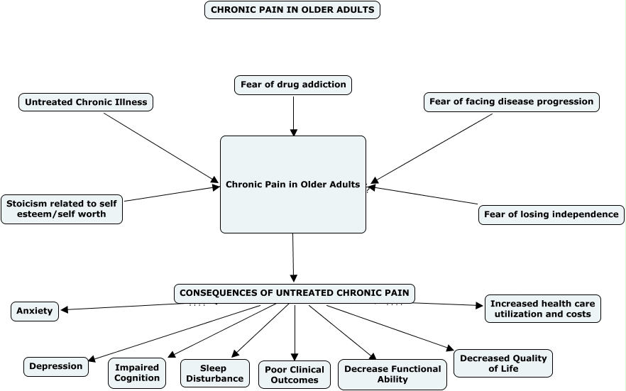 This Concept Map, created with IHMC CmapTools, has information related to: Chronic Pain.cmap, CONSEQUENCES OF UNTREATED CHRONIC PAIN ???? Increased health care utilization and costs, CONSEQUENCES OF UNTREATED CHRONIC PAIN ???? Impaired Cognition, Fear of facing disease progression ???? Chronic Pain in Older Adults, CONSEQUENCES OF UNTREATED CHRONIC PAIN ???? Anxiety, Fear of drug addiction ???? Chronic Pain in Older Adults, Chronic Pain in Older Adults ???? CONSEQUENCES OF UNTREATED CHRONIC PAIN, CONSEQUENCES OF UNTREATED CHRONIC PAIN ???? Sleep Disturbance, Untreated Chronic Illness ???? Chronic Pain in Older Adults, CONSEQUENCES OF UNTREATED CHRONIC PAIN ???? Depression, Fear of losing independence ???? Chronic Pain in Older Adults, CONSEQUENCES OF UNTREATED CHRONIC PAIN ???? Decrease Functional Ability, Stoicism related to self esteem/self worth ???? Chronic Pain in Older Adults, CONSEQUENCES OF UNTREATED CHRONIC PAIN ???? Poor Clinical Outcomes, CONSEQUENCES OF UNTREATED CHRONIC PAIN ???? Decreased Quality of Life