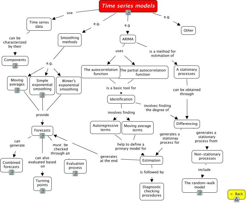 This Concept Map, created with IHMC CmapTools, has information related to: Time series models, Time series models e.g. Other, The autocorrelation function is a basic tool for Identification, Estimation generates at the end Forecasts, Simple exponential smoothing provide Forecasts, Identification involves finding the degree of Differencing, Smoothing methods e.g. Winter's exponential smoothing, A stationary processes can be obtained through Differencing, Moving average terms help to define a primary model for Estimation, Smoothing methods e.g. Moving averages, Identification involves finding Autoregressive terms, Smoothing methods e.g. Simple exponential smoothing, ARIMA uses The partial autocorrelation function, Forecasts can generate Combined forecasts, ARIMA uses The autocorrelation function, The partial autocorrelation function is a basic tool for Identification, Time series models use Time series data, Differencing generates a stationay process for Estimation, Moving averages provide Forecasts, Autoregressive terms help to define a primary model for Estimation, Differencing generates a stationary process from Non-stationary processes