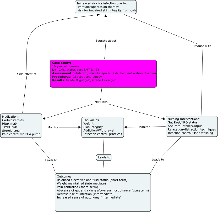 This Concept Map, created with IHMC CmapTools, has information related to: Acute Graft versus Host Disease (GVH), Lab values Weight Skin integrity Addiction/Withdrawal Infection control practices ???? Outcomes: Balanced electolyes and fluid status (short term) Weight maintained (intermediate) Pain controlled (short term) Abscense of gut and skin graft-versus host disease (Long term) Decrese risk of infection (intermediate) Increased sense of autonomy (intermediate), Medication: Corticosteroids Rituximab TPN/Lipids Steroid cream Pain control via PCA pump Leads to Outcomes: Balanced electolyes and fluid status (short term) Weight maintained (intermediate) Pain controlled (short term) Abscense of gut and skin graft-versus host disease (Long term) Decrese risk of infection (intermediate) Increased sense of autonomy (intermediate), Case Study: 16 year old female Dx: CML, status post BMT D+24 Assessment: Vitals wnl, maculopapular rash, frequent watery diarrhea Procedures: GI scope and biopsy Results: Grade II gut gvh, Grade I skin gvh Educate about Increased risk for infection due to: immunosuppression therapy risk for impaired skin integrity from gvh, Nursing Interventions: Gut Rest/NPO status Accurate Intake/Output Relaxation/distraction techniques Infection control/Hand washing Leads to Outcomes: Balanced electolyes and fluid status (short term) Weight maintained (intermediate) Pain controlled (short term) Abscense of gut and skin graft-versus host disease (Long term) Decrese risk of infection (intermediate) Increased sense of autonomy (intermediate), Increased risk for infection due to: immunosuppression therapy risk for impaired skin integrity from gvh reduce with ????, Medication: Corticosteroids Rituximab TPN/Lipids Steroid cream Pain control via PCA pump Side effect of Increased risk for infection due to: immunosuppression therapy risk for impaired skin integrity from gvh, Medication: Corticosteroids Rituximab TPN/Lipids Steroid cream Pain control via PCA pump Monitor Lab values Weight Skin integrity Addiction/Withdrawal Infection control practices, Nursing Interventions: Gut Rest/NPO status Accurate Intake/Output Relaxation/distraction techniques Infection control/Hand washing Monitor Lab values Weight Skin integrity Addiction/Withdrawal Infection control practices, Case Study: 16 year old female Dx: CML, status post BMT D+24 Assessment: Vitals wnl, maculopapular rash, frequent watery diarrhea Procedures: GI scope and biopsy Results: Grade II gut gvh, Grade I skin gvh Treat with Medication: Corticosteroids Rituximab TPN/Lipids Steroid cream Pain control via PCA pump, Case Study: 16 year old female Dx: CML, status post BMT D+24 Assessment: Vitals wnl, maculopapular rash, frequent watery diarrhea Procedures: GI scope and biopsy Results: Grade II gut gvh, Grade I skin gvh Treat with Nursing Interventions: Gut Rest/NPO status Accurate Intake/Output Relaxation/distraction techniques Infection control/Hand washing