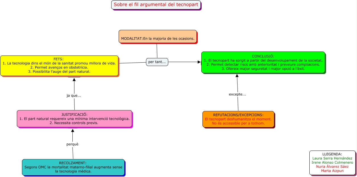 Este Cmap, tiene información relacionada con: 2011.11.27_18.00_Inma, RECOLZAMENT: Segons OMC la mortalitat materno-filial augmenta sense la tecnologia mèdica. perquè ????, FETS: 1. La tecnologia dins el món de la sanitat promou millora de vida. 2. Permet avenços en obstetrícia. 3. Possibilita l'auge del part natural. ???? CONCLUSIÓ: 1. El tecnopart ha sorgit a partir del desenvolupament de la societat. 2. Permet detectar riscs amb anterioritat i preveure compliacions. 3. Ofereix major seguretat i major opció a l'èxit., JUSTIFICACIÓ: 1. El part natural requereix una mínima intervenció tecnològica. 2. Necessita controls previs. ja que... ????, MODALITAT:En la majoria de les ocasions. ???? per tant..., REFUTACIONS/EXCEPCIONS: El tecnopart deshumanitza el moment. No és accessible per a tothom. excepte... ????
