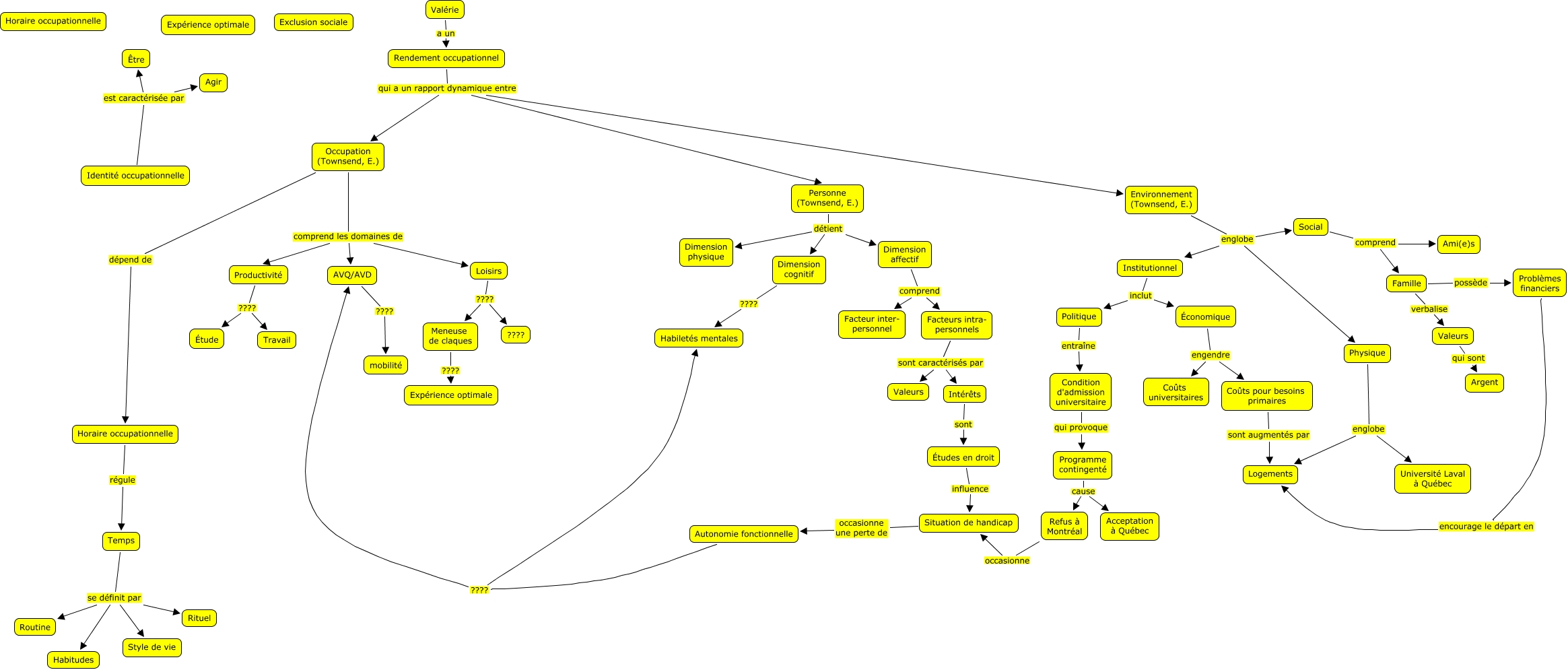 Cette carte de concepts créée avec IHMC CmapTools traite de: Notre C-map finalisée, Loisirs ???? Meneuse de claques, Dimension affectif comprend Facteur inter- personnel, Famille possède Problèmes financiers, Environnement (Townsend, E.) englobe Physique, Productivité ???? Travail, Rendement occupationnel qui a un rapport dynamique entre Occupation (Townsend, E.), AVQ/AVD ???? mobilité, Occupation (Townsend, E.) comprend les domaines de AVQ/AVD, Social comprend Ami(e)s, Personne (Townsend, E.) détient Dimension affectif, Refus à Montréal occasionne Situation de handicap, Environnement (Townsend, E.) englobe Institutionnel, Programme contingenté cause Refus à Montréal, Études en droit influence Situation de handicap, Loisirs ???? ????, Personne (Townsend, E.) détient Dimension cognitif, Horaire occupationnelle régule Temps, Valeurs qui sont Argent, Famille verbalise Valeurs, Occupation (Townsend, E.) comprend les domaines de Productivité
