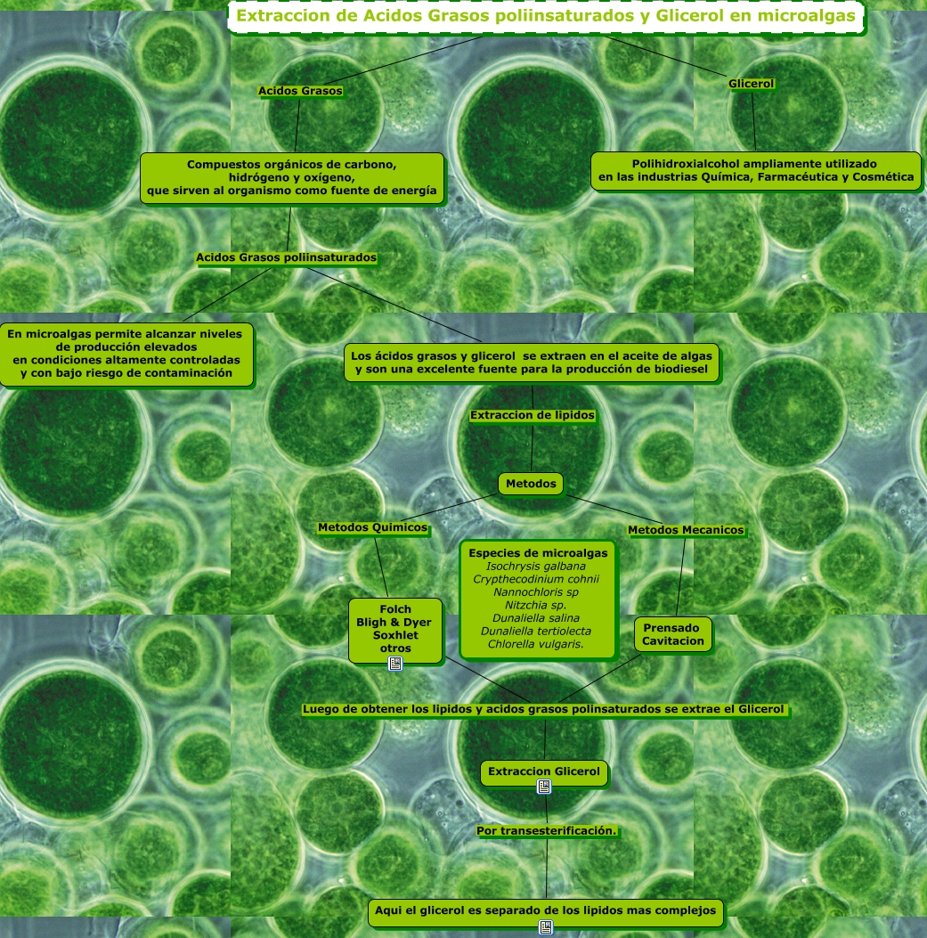 Este Cmap, tiene información relacionada con: Acidos Grasos Piinsaturados y Gliceridos, Extraccion Glicerol Por transesterificación. Aqui el glicerol es separado de los lipidos mas complejos, Extraccion de Acidos Grasos poliinsaturados y Glicerol en microalgas Glicerol Polihidroxialcohol ampliamente utilizado en las industrias Química, Farmacéutica y Cosmética, Compuestos orgánicos de carbono, hidrógeno y oxígeno, que sirven al organismo como fuente de energía Acidos Grasos poliinsaturados En microalgas permite alcanzar niveles de producción elevados en condiciones altamente controladas y con bajo riesgo de contaminación, Los ácidos grasos y glicerol se extraen en el aceite de algas y son una excelente fuente para la producción de biodiesel Extraccion de lipidos Metodos, Folch Bligh & Dyer Soxhlet otros Luego de obtener los lipidos y acidos grasos polinsaturados se extrae el Glicerol Extraccion Glicerol, Extraccion de Acidos Grasos poliinsaturados y Glicerol en microalgas Acidos Grasos Compuestos orgánicos de carbono, hidrógeno y oxígeno, que sirven al organismo como fuente de energía, Compuestos orgánicos de carbono, hidrógeno y oxígeno, que sirven al organismo como fuente de energía Acidos Grasos poliinsaturados Los ácidos grasos y glicerol se extraen en el aceite de algas y son una excelente fuente para la producción de biodiesel, Prensado Cavitacion Luego de obtener los lipidos y acidos grasos polinsaturados se extrae el Glicerol Extraccion Glicerol, Metodos Metodos Quimicos Folch Bligh & Dyer Soxhlet otros, Metodos Metodos Mecanicos Prensado Cavitacion