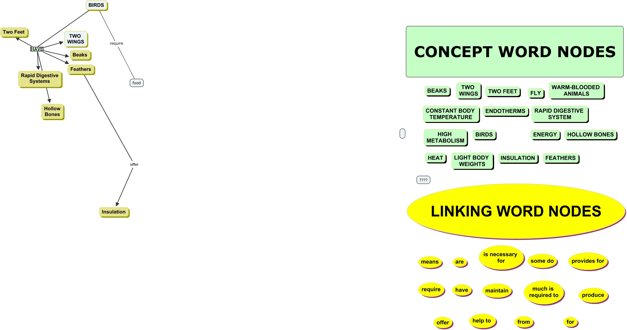 This Concept Map, created with IHMC CmapTools, has information related to: Birds Leg ONE, BIRDS HAVE Feathers, BIRDS HAVE Rapid Digestive Systems, BIRDS HAVE Beaks, Feathers offer Insulation, BIRDS require food, BIRDS HAVE Two Feet, BIRDS HAVE TWO WINGS, BIRDS HAVE Hollow Bones