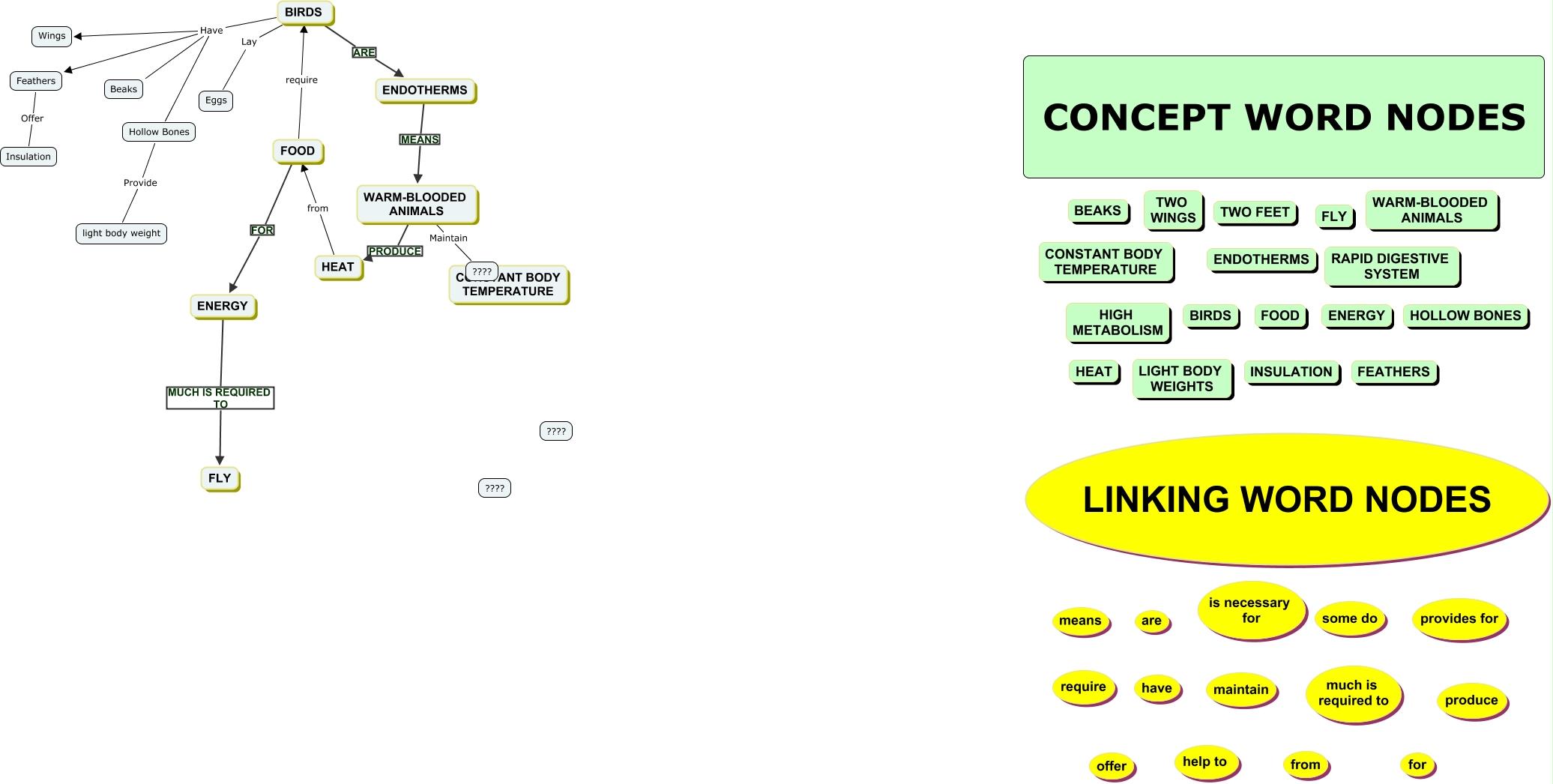 This Concept Map, created with IHMC CmapTools, has information related to: Birds Leg TWO, Hollow Bones Provide light body weight, BIRDS Have Wings, BIRDS Have Feathers, ENDOTHERMS MEANS WARM-BLOODED ANIMALS, BIRDS Have Beaks, FOOD FOR ENERGY, WARM-BLOODED ANIMALS PRODUCE HEAT, BIRDS ARE ENDOTHERMS, FOOD require BIRDS, BIRDS Lay Eggs, Feathers Offer Insulation, BIRDS Have Hollow Bones, WARM-BLOODED ANIMALS Maintain ????, ENERGY MUCH IS REQUIRED TO FLY, HEAT from FOOD