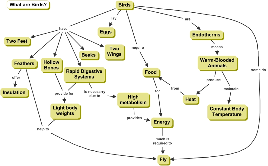 This Concept Map, created with IHMC CmapTools, has information related to: BIRD COLLABORATIVE PROJECT1, Birds have Two Wings, Light body weights help to Fly, Birds have Rapid Digestive Systems, Birds are Endotherms, Rapid Digestive Systems is necesarry due to High metabolism, Birds have Hollow Bones, Birds some do Fly, Hollow Bones provide for Light body weights, Birds require Food, Birds have Beaks, Endotherms means Warm-Blooded Animals, Feathers offer Insulation, Food for Energy, Warm-Blooded Animals produce Heat, Heat from Food, Birds lay Eggs, High metabolism provides Energy, Birds have Two Feet, Energy much is required to Fly, Warm-Blooded Animals maintain Constant Body Temperature
