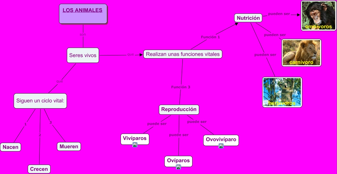 Este Cmap, tiene información relacionada con: Los animales, LOS ANIMALES son Seres vivos, Nutrición pueden ser carnívoro, Siguen un ciclo vital: 3 Mueren, Siguen un ciclo vital: 2 Crecen, Realizan unas funciones vitales Función 1 Nutrición, Seres vivos que Realizan unas funciones vitales, Nutrición pueden ser herbívoros, Seres vivos que Siguen un ciclo vital:, Reproducción puede ser Ovíparos, Nutrición pueden ser omnívoros, Realizan unas funciones vitales Función 3 Reproducción, Reproducción puede ser Ovovivíparo, Siguen un ciclo vital: 1 Nacen, Reproducción puede ser Vivíparos