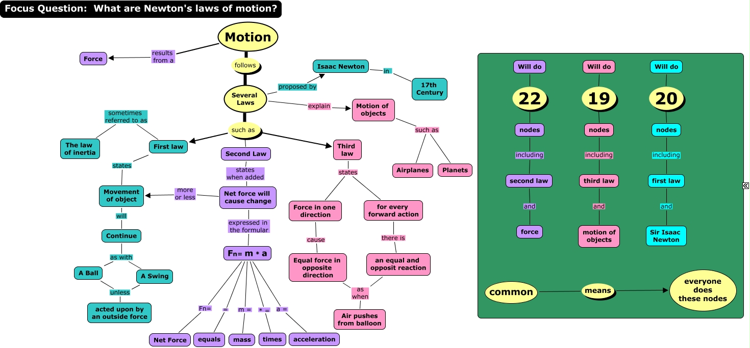 This Concept Map, created with IHMC CmapTools, has information related to: Newton Laws complete map no imbedded media, Fn= m * a Fn= Net Force, First law states Movement of object, nodes including second law, Continue as with A Ball, Third law states Force in one direction, Will do 19 nodes, third law and motion of objects, Fn= m * a a = acceleration, Several Laws explain Motion of objects, Several Laws such as Third law, nodes including first law, Fn= m * a = equals, Isaac Newton in 17th Century, First law sometimes referred to as The law of inertia, common means everyone does these nodes, Third law states for every forward action, Net force will cause change expressed in the formular Fn= m * a, nodes including third law, Fn= m * a * = times, Fn= m * a m = mass