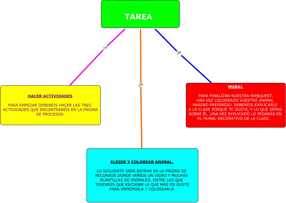Este Cmap, tiene información relacionada con: TAREA, TAREA 2ª ELEGIR Y COLOREAR ANIMAL. LO SIGUIENTE SERÁ ENTRAR EN LA PÁGINA DE RECURSOS DONDE VERÉIS UN VIDEO Y MUCHAS PLANTILLAS DE ANIMALES, ENTRE LAS QUE TENDRÉIS QUE ESCOGER LA QUE MÁS OS GUSTE PARA IMPRIMIRLA Y COLOREARLA., TAREA 3ª MURAL PARA FINALIZAR NUESTRA WEBQUEST, UNA VEZ COLOREADO VUESTRO ANIMAL MARINO PREFERÍDO. DEBERÉIS EXPLICARLE A LA CLASE PORQUE TE GUSTA, Y LO QUE SEPAS SOBRE ÉL. UNA VEZ EXPLICADO LO PEGARÁS EN EL MURAL DECORATIVO DE LA CLASE., TAREA 1ª HACER ACTIVIDADES PARA EMPEZAR DEBERÉIS HACER LAS TRES ACTIVIDADES QUE ENCONTRARÉIS EN LA PÁGINA DE PROCESOS.