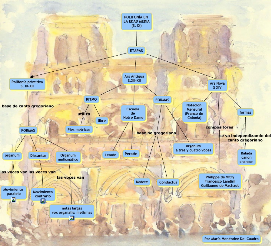 Este Cmap, tiene información relacionada con: polifonía medieval, ETAPAS Ars Antiqua S.XII-XII, formas se va independizando del canto gregoriano Balada canon chanson, RITMO utiliza Pies métricos, organum las voces van Movimiento paralelo, FORMAS organum, Ars Antiqua S.XII-XII FORMAS, Discantus las voces van Movimiento contrario, POLIFONÍA EN LA EDAD MEDIA (S. IX) ETAPAS, Ars Nova S XIV compositores Philippe de Vitry Francesco Landini Guillaume de Machaut, Polifonía primitiva S. IX-XII base de canto gregoriano FORMAS, FORMAS base no gregoriana Motete, Ars Nova S XIV formas, FORMAS Discantus, Escuela de Notre Dame Perotin, Ars Antiqua S.XII-XII Escuela de Notre Dame, ETAPAS Ars Nova S XIV, Organum melismático las voces van notas largas vox organalis: melismas, Ars Antiqua S.XII-XII RITMO, RITMO libre, Ars Nova S XIV Notación Mensural (Franco de Colonia)