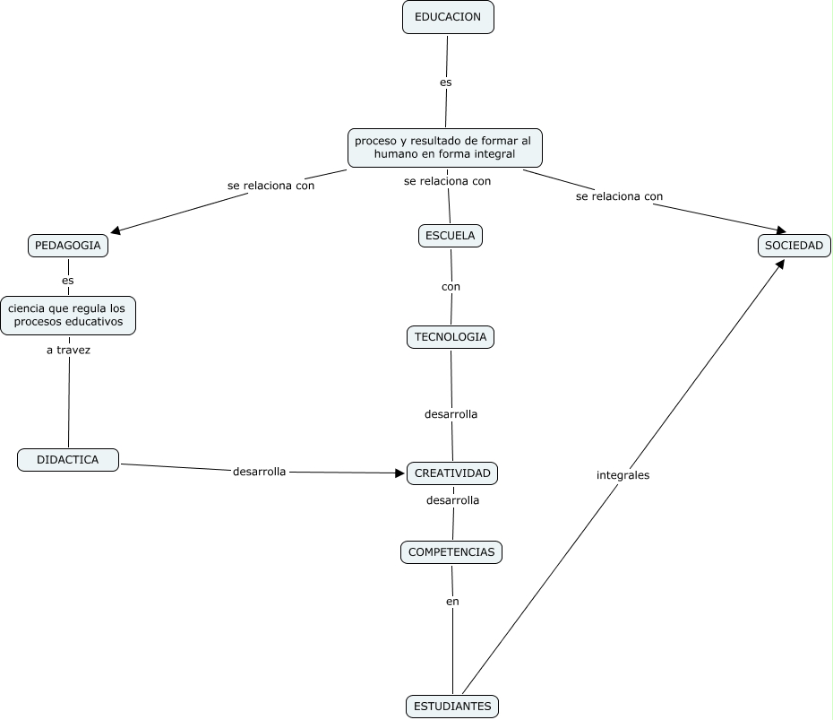 Este Cmap, tiene información relacionada con: FREDYRIOS_G8, PEDAGOGIA es ciencia que regula los procesos educativos, ESCUELA con TECNOLOGIA, proceso y resultado de formar al humano en forma integral se relaciona con PEDAGOGIA, proceso y resultado de formar al humano en forma integral se relaciona con ESCUELA, ESTUDIANTES integrales SOCIEDAD, proceso y resultado de formar al humano en forma integral se relaciona con SOCIEDAD, DIDACTICA desarrolla CREATIVIDAD, COMPETENCIAS en ESTUDIANTES, ciencia que regula los procesos educativos a travez DIDACTICA, TECNOLOGIA desarrolla CREATIVIDAD, CREATIVIDAD desarrolla COMPETENCIAS, EDUCACION es proceso y resultado de formar al humano en forma integral