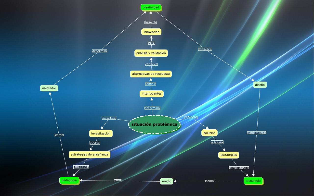 Este Cmap, tiene información relacionada con: edna-g8, analisis y validación para innovación, mediador desarrolla creatividad, innovación base de creatividad, pedagogía como mediador, situación problémica determina interrogantes, alternativas de respuesta conlleva analisis y validación, investigación aporta estrategias de enseñanza, medio para pedagogía, situación problémica incentiva investigación, solución a través estrategias, estrategias consolidando tecnología, diseño fundamental tecnología, creatividad fortalece diseño, tecnología como medio, estrategias de enseñanza constituye pedagogía, interrogantes genera alternativas de respuesta, situación problémica requiere solución