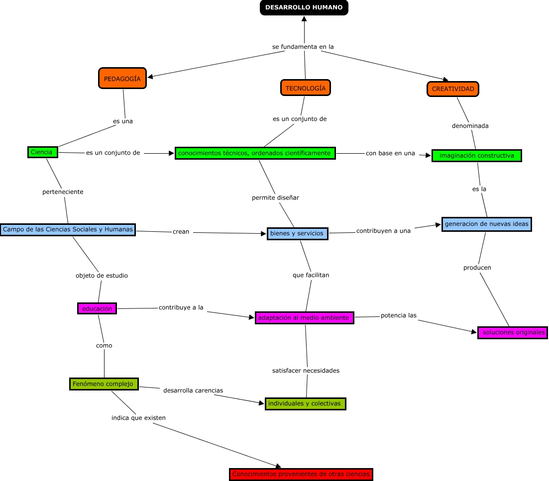 Este Cmap, tiene información relacionada con: DIANALEMUSBOG8, Fenómeno complejo indica que existen Conocimientos provenientes de otras ciencias, imaginación constructiva es la generacion de nuevas ideas, CREATIVIDAD denominada imaginación constructiva, adaptación al medio ambiente satisfacer necesidades individuales y colectivas, conocimientos técnicos, ordenados científicamente permite diseñar bienes y servicios, generacion de nuevas ideas producen soluciones originales, educación como Fenómeno complejo, PEDAGOGÍA es una Ciencia, adaptación al medio ambiente potencia las soluciones originales, TECNOLOGÍA se fundamenta en la CREATIVIDAD, educación contribuye a la adaptación al medio ambiente, bienes y servicios contribuyen a una generacion de nuevas ideas, Fenómeno complejo desarrolla carencias individuales y colectivas, Ciencia es un conjunto de conocimientos técnicos, ordenados científicamente, bienes y servicios que facilitan adaptación al medio ambiente, Ciencia perteneciente Campo de las Ciencias Sociales y Humanas, TECNOLOGÍA se fundamenta en la PEDAGOGÍA, conocimientos técnicos, ordenados científicamente con base en una imaginación constructiva, Campo de las Ciencias Sociales y Humanas crean bienes y servicios, TECNOLOGÍA se fundamenta en la DESARROLLO HUMANO