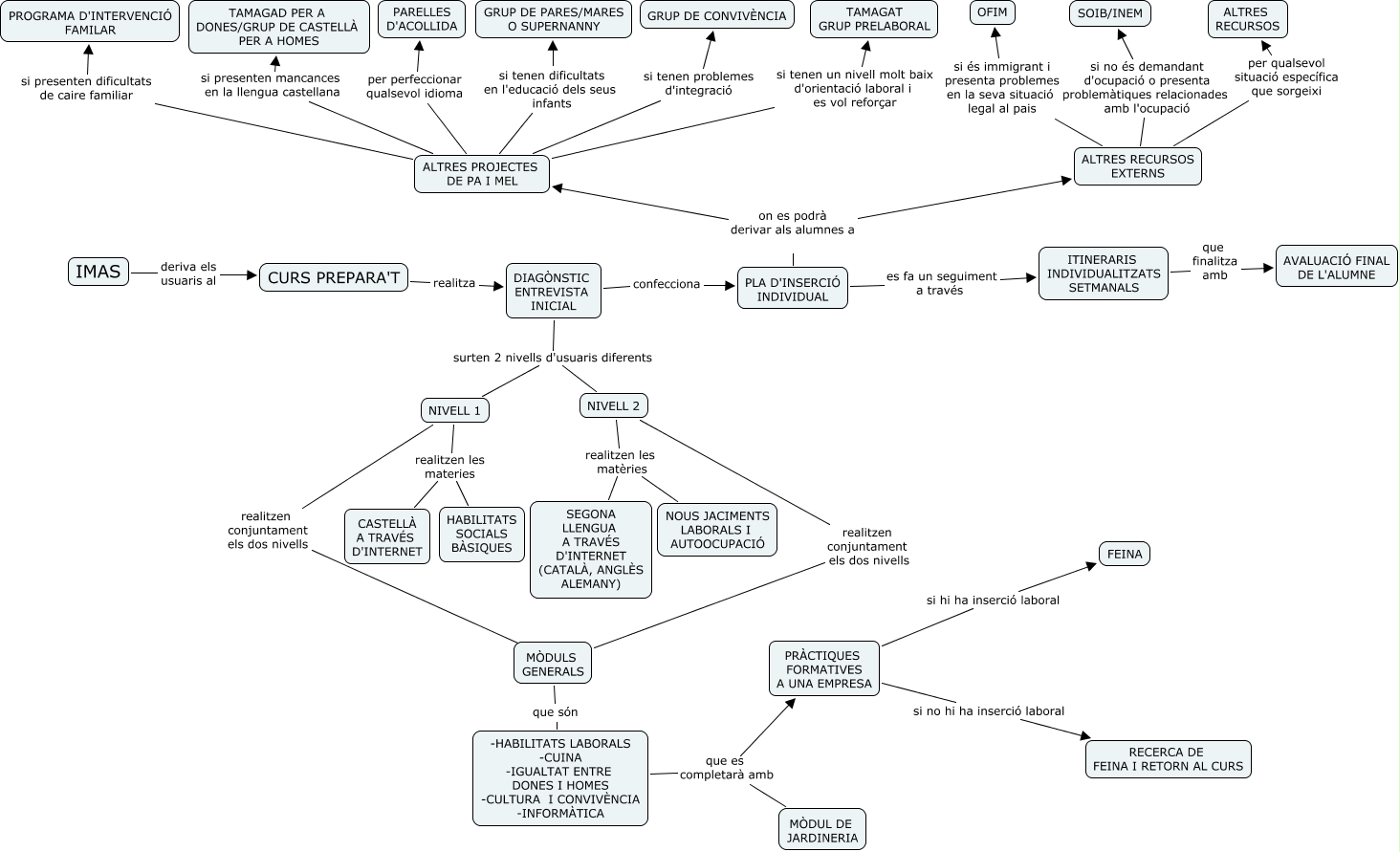 Aquest mapa conceptual conté informació relacionada amb: PREPARA'T[1].cmap, PRÀCTIQUES FORMATIVES A UNA EMPRESA si no hi ha inserció laboral RECERCA DE FEINA I RETORN AL CURS, ALTRES PROJECTES DE PA I MEL si presenten mancances en la llengua castellana TAMAGAD PER A DONES/GRUP DE CASTELLÀ PER A HOMES, NIVELL 2 realitzen les matèries SEGONA LLENGUA A TRAVÉS D'INTERNET (CATALÀ, ANGLÈS ALEMANY), NIVELL 1 realitzen les materies CASTELLÀ A TRAVÉS D'INTERNET, NIVELL 1 realitzen conjuntament els dos nivells ????, NIVELL 2 realitzen conjuntament els dos nivells MÒDULS GENERALS, ALTRES PROJECTES DE PA I MEL si tenen un nivell molt baix d'orientació laboral i es vol reforçar TAMAGAT GRUP PRELABORAL, ALTRES RECURSOS EXTERNS si no és demandant d'ocupació o presenta problemàtiques relacionades amb l'ocupació SOIB/INEM, PLA D'INSERCIÓ INDIVIDUAL on es podrà derivar als alumnes a ALTRES RECURSOS EXTERNS, MÒDULS GENERALS que són -HABILITATS LABORALS -CUINA -IGUALTAT ENTRE DONES I HOMES -CULTURA I CONVIVÈNCIA -INFORMÀTICA, NIVELL 1 realitzen les materies HABILITATS SOCIALS BÀSIQUES, ALTRES PROJECTES DE PA I MEL si presenten dificultats de caire familiar PROGRAMA D'INTERVENCIÓ FAMILAR, -HABILITATS LABORALS -CUINA -IGUALTAT ENTRE DONES I HOMES -CULTURA I CONVIVÈNCIA -INFORMÀTICA que es completarà amb PRÀCTIQUES FORMATIVES A UNA EMPRESA, NIVELL 2 realitzen les matèries NOUS JACIMENTS LABORALS I AUTOOCUPACIÓ, DIAGÒNSTIC ENTREVISTA INICIAL surten 2 nivells d'usuaris diferents NIVELL 2, ITINERARIS INDIVIDUALITZATS SETMANALS que finalitza amb AVALUACIÓ FINAL DE L'ALUMNE, ALTRES RECURSOS EXTERNS si és immigrant i presenta problemes en la seva situació legal al pais OFIM, ALTRES PROJECTES DE PA I MEL si tenen problemes d'integració GRUP DE CONVIVÈNCIA, CURS PREPARA'T realitza DIAGÒNSTIC ENTREVISTA INICIAL, PLA D'INSERCIÓ INDIVIDUAL on es podrà derivar als alumnes a ALTRES PROJECTES DE PA I MEL