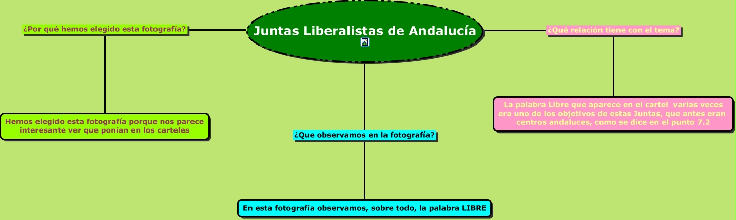 Este Cmap, tiene información relacionada con: Tema 11 Comentario fotografía cartel juntas liberalistas de Andalucía, Juntas Liberalistas de Andalucía ¿Qué relación tiene con el tema? La palabra Libre que aparece en el cartel varias veces era uno de los objetivos de estas Juntas, que antes eran centros andaluces, como se dice en el punto 7.2, Juntas Liberalistas de Andalucía ¿Que observamos en la fotografía? En esta fotografía observamos, sobre todo, la palabra LIBRE, Juntas Liberalistas de Andalucía ¿Por qué hemos elegido esta fotografía? Hemos elegido esta fotografía porque nos parece interesante ver que ponían en los carteles