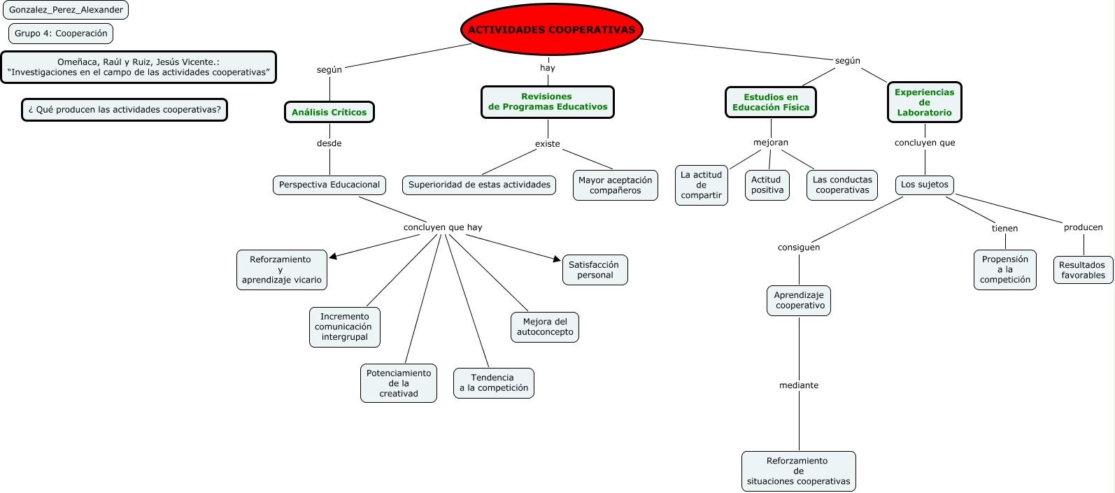 Este Cmap, tiene información relacionada con: ALEXANDER_GONZALEZ_PEREZ_G4, Revisiones de Programas Educativos existe Mayor aceptación compañeros, ACTIVIDADES COOPERATIVAS hay Revisiones de Programas Educativos, Análisis Críticos desde Perspectiva Educacional, ACTIVIDADES COOPERATIVAS según Estudios en Educación Física, Estudios en Educación Física mejoran La actitud de compartir, Perspectiva Educacional concluyen que hay Incremento comunicación intergrupal, Revisiones de Programas Educativos existe Superioridad de estas actividades, Los sujetos tienen Propensión a la competición, Estudios en Educación Física mejoran Actitud positiva, Los sujetos producen Resultados favorables, Perspectiva Educacional concluyen que hay Satisfacción personal, Aprendizaje cooperativo mediante Reforzamiento de situaciones cooperativas, Perspectiva Educacional concluyen que hay Reforzamiento y aprendizaje vicario, Perspectiva Educacional concluyen que hay Mejora del autoconcepto, Perspectiva Educacional concluyen que hay Potenciamiento de la creativad, Perspectiva Educacional concluyen que hay Tendencia a la competición, Experiencias de Laboratorio concluyen que Los sujetos, ACTIVIDADES COOPERATIVAS según Experiencias de Laboratorio, Los sujetos consiguen Aprendizaje cooperativo, ACTIVIDADES COOPERATIVAS según Análisis Críticos