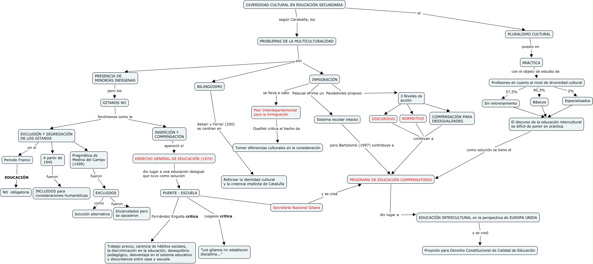 Este Cmap, tiene información relacionada con: CASTILLO_ALVIRA_DANIEL_cmap_G3_cmap, PROGRAMA DE EDUCACIÓN COMPENSATORIO dio lugar a EDUCACIÓN INTERCULTURAL en la perspectiva de EUROPA UNIDA, 3 Niveles de acción ???? DISCURSIVO, EXCLUIDOS fueron Encarcelados pero se opusieron, PUENTE - ESCUELA ???? Secretaría Nacional Gitana, EXCLUSIÓN Y SEGREGACIÓN DE LOS GITANOS en el Periodo Franco, DIVERSIDAD CULTURAL EN EDUCACIÓN SECUNDARIA el PLURALISMO CULTURAL, Sistema escolar intacto pero Bartolomé (1997) contribuye a PROGRAMA DE EDUCACIÓN COMPENSATORIO, EXCLUSIÓN Y SEGREGACIÓN DE LOS GITANOS ???? Pragmática de Medina del Campo (1499), INMIGRACIÓN Pascual afrima un Sistema escolar intacto, INMIGRACIÓN se lleva a cabo Plan Interdepartamental para la Inmigración, 3 Niveles de acción ???? COMPENSACIÓN PARA DESIGUALDADES, Básicos ???? El discurso de la educación intercultural es difícil de poner en práctica, Especializados ???? El discurso de la educación intercultural es difícil de poner en práctica, PUENTE - ESCUELA M. Fernández Enguita critica Trabajo precoz, carencia de hábitos sociales, la discriminación en la educación, desequlibrio pedagógico, desventaja en el sistema educativo y discordancia entre casa y escuela, 3 Niveles de acción ???? NORMATIVO, Periodo Franco EDUCACIÓN NO obligatoria, Sin entrenamiento ???? El discurso de la educación intercultural es difícil de poner en práctica, PROBLEMAS DE LA MULTICULTURALIDAD son PRESENCIA DE MINORÍAS INDÍGENAS, PROBLEMAS DE LA MULTICULTURALIDAD son INMIGRACIÓN, COMPENSACIÓN PARA DESIGUALDADES conllevan a PROGRAMA DE EDUCACIÓN COMPENSATORIO